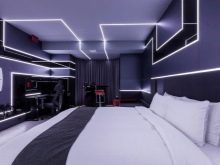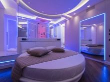 Колкото повече огледала, толкова по -добре - един от основните принципи на този стил. Необичайната форма и осветление ще направят стаята да прилича повече на извънземен кораб.