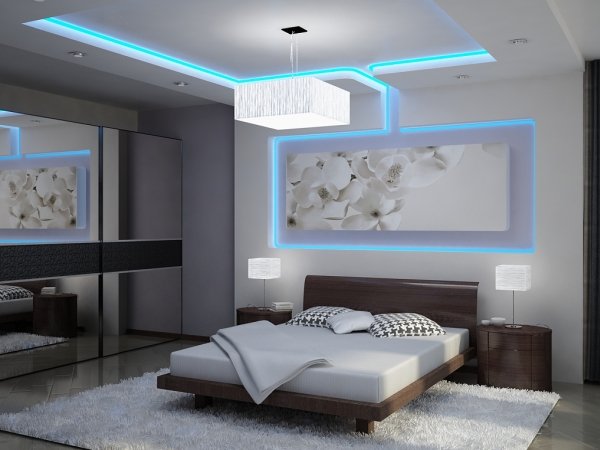 Сините светодиоди съвпадат както с бели, така и със сиви стени... На фона на черния таван те изглеждат просто магически.
