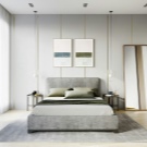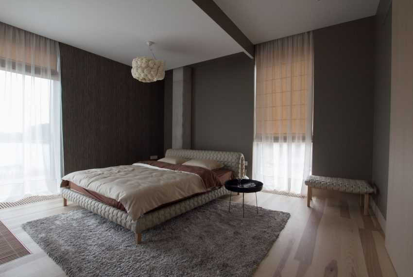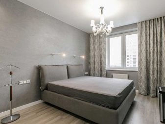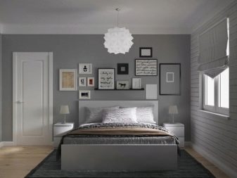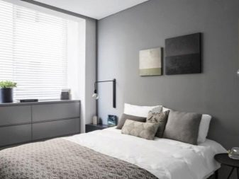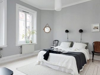 - Сивата спалня изглежда привлекателна и релаксираща. В такава среда можете да си починете от тежък работен ден или шумна улица, да се пенсионирате и да се насладите на релакс. Бялото легло е стилен интериорен акцент в тандем с компактни снежно бели нощни шкафчета. Големите прозорци осигуряват добро осветление на стаята. Сиви стени, фотьойл и мек килим се открояват за разлика от бяло легло и подови настилки. Зелените стайни растения са изискано допълнение.