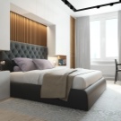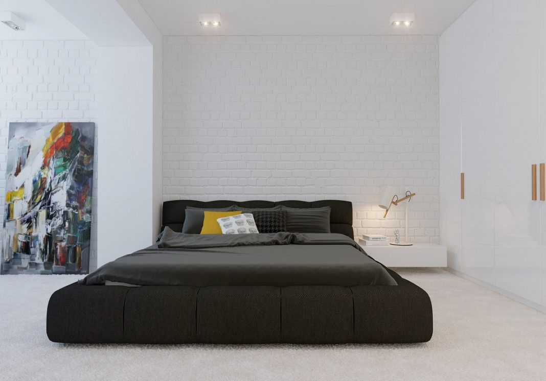 - Комбинацията от бели и черни цветове изглежда много стилна и елегантна. Светлите стени и тавани, както и снежнобялата настилка подчертават наличието на черно легло. Тя действа като ярък акцент в интериора на спалнята. Картина, направена в различни цветове, придава на стаята драматичен ефект. В интериора са включени няколко източника на светлина. Акцентът в дизайна на леглото е наличието на възглавници в няколко цвята.