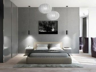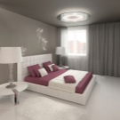 Минимализмът не толерира стари висящи полилеи, допълнени с декорации. Изберете плафон за централен източник на светлина за дърво или метал. Прожекторите, които могат да бъдат поставени по периметъра на спалнята или по протежение на противоположните стени, са отличен избор.