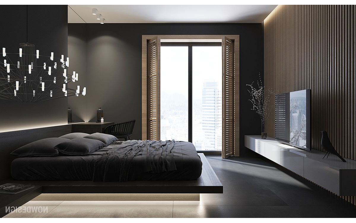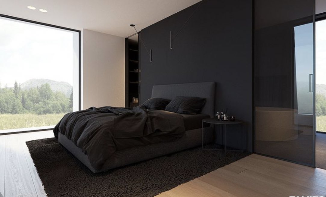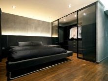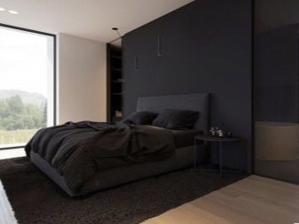 - Черен. Разбира се, този цвят не може да се приеме като основен дори за големи спални, тъй като е възможно да се въплъти доста мрачна и тежка атмосфера. Черният цвят ще блести привлекателно на светъл фон. Черно -бялата палитра ще бъде чудесен избор за въплъщение на интериора в минималистичен стил. Черните покривки, рафтовете и корпусът на шкафа изглеждат елегантни, ако дизайнът на спалнята е представен в светли или пастелни цветове.