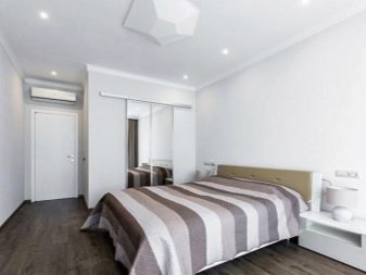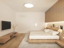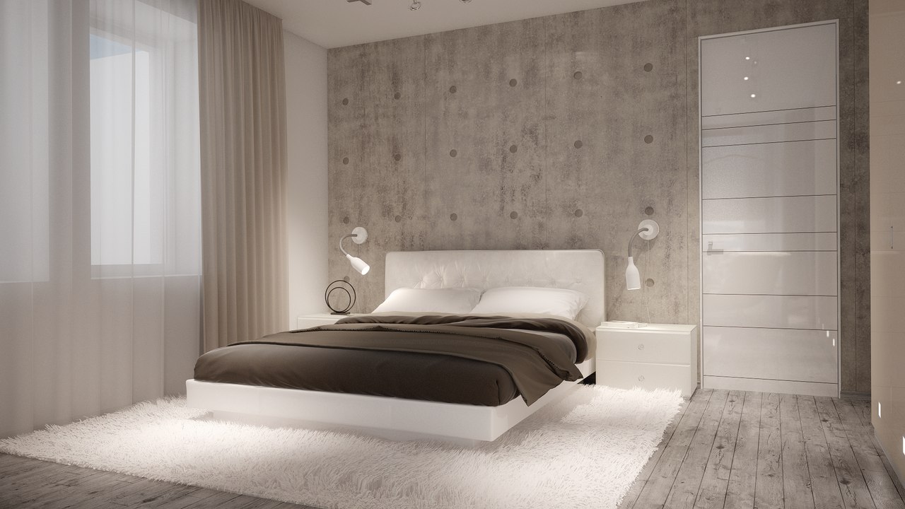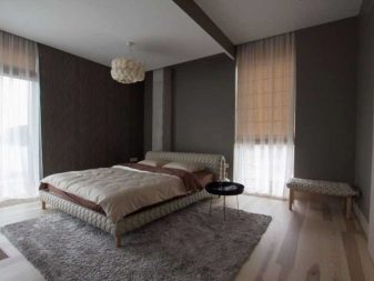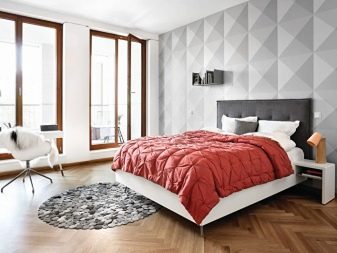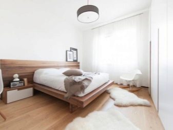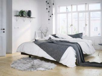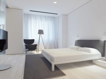 Най -простото решение за минималистични подови настилки е да се използва ламинат, защото е практичен и универсален. Същото не може да се каже за паркета, защото той е доста капризен в грижите си. Ламинатът, подобно на паркета, ви позволява да създадете уют в спалнята. Ако искате да направите топъл под, тогава можете да поставите големи плочки. Уютът ще ви позволи да добавите килим близо до леглото.