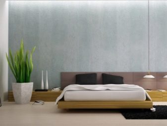 Минималистична спалня трябва да бъде проста и удобна.За декорация на стени боята на водна основа (за предпочитане едноцветна) е идеална. Ако има желание да се трансформира нещо, тогава цветът на стените може лесно да се промени. Ако сте по -привлечени от тапети, тогава се препоръчва да останете на прости отпечатъци, липса на шарки и сложни текстури.
