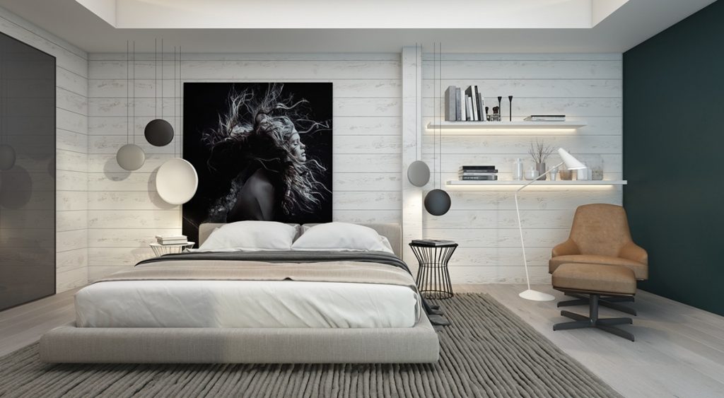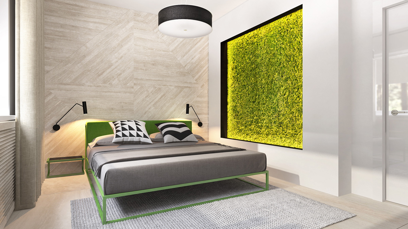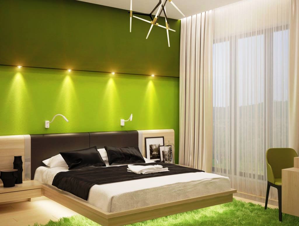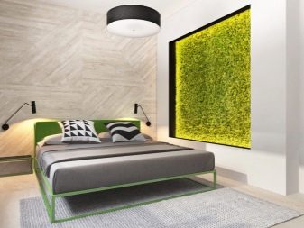 - Ако харесвате необичайни решения, можете да комбинирате светлозелени, бели и черни нюанси. Правите линии, ярките цветове и лаконичните мебели изглеждат доста елегантни. Интересни лампи и вази-крушки придават на интериора футуристичен вид, добавяйки яркост и ефектност в стаята. Големите прозорци, украсени със светъл тюл, изпълват пространството със светлина. Точковото осветление привлича вниманието към централния елемент на интериора - леглото.