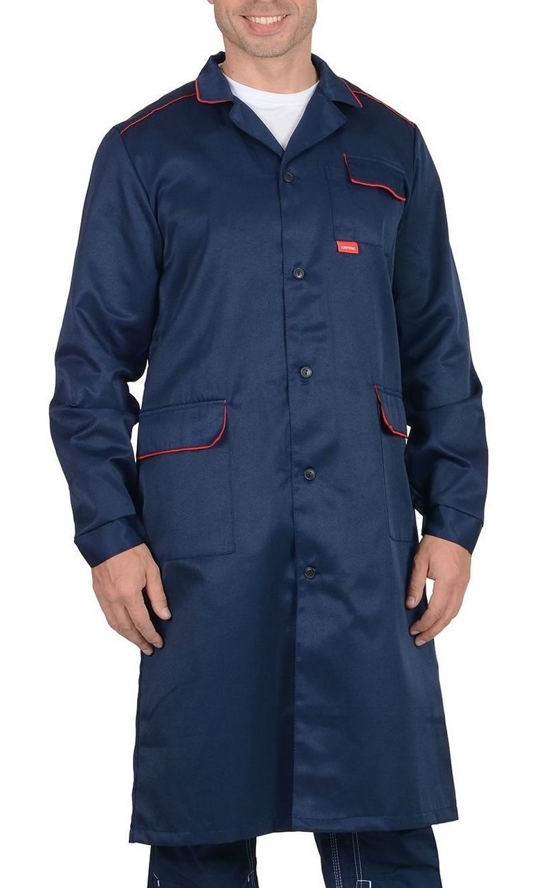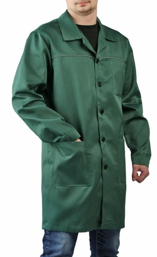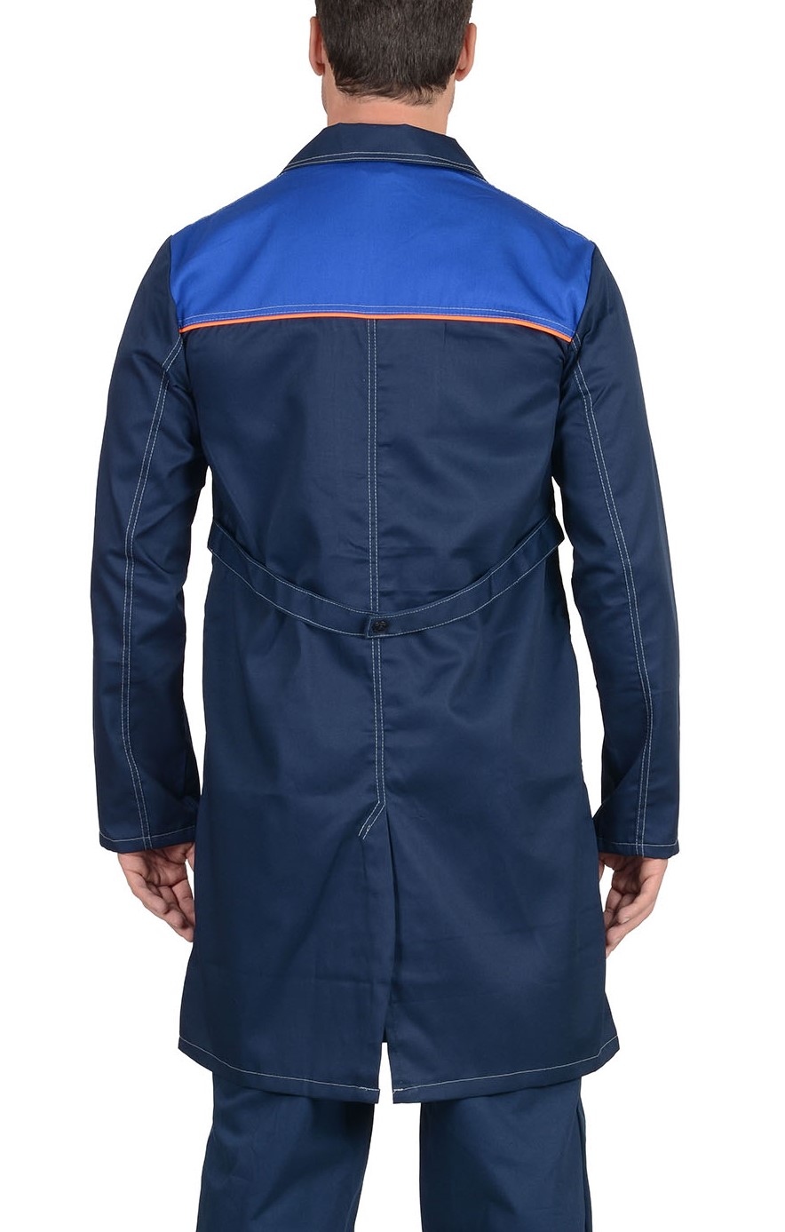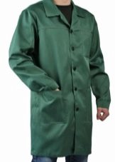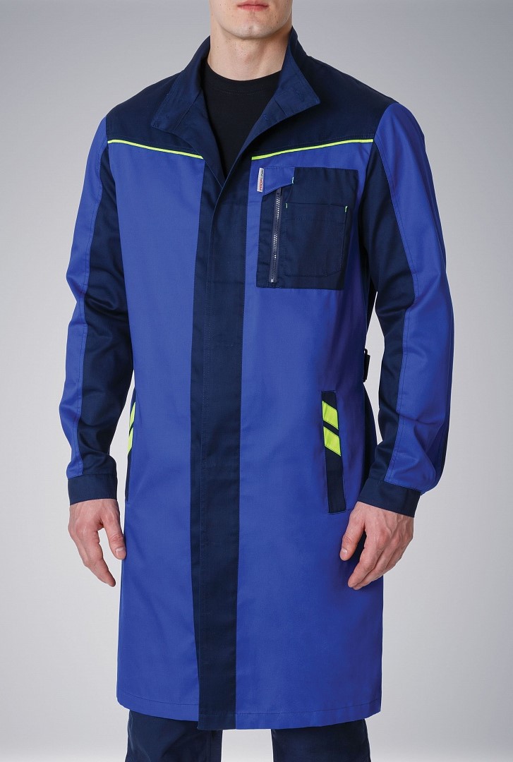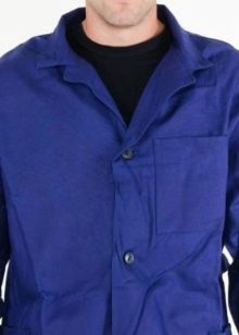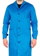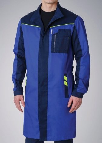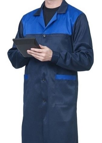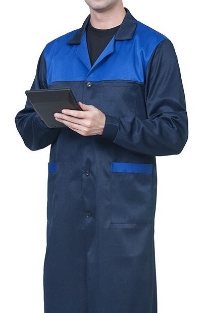 Търговските работници, товарачите се предлагат с технологични халати, ушит от смесен материал, който дава минимално свиване, богата синя цветова гама с ярки синьо-сини вложки на гърба и в областта на джобовете. Линията на игото е украсена с тръба, която отразява светлинните лъчи. Това е изрязан халат с прав силует, закопчан с копчета. Има джобове отдолу и един на гърдите.