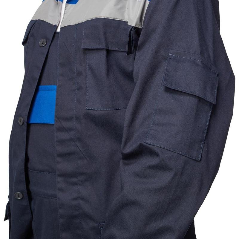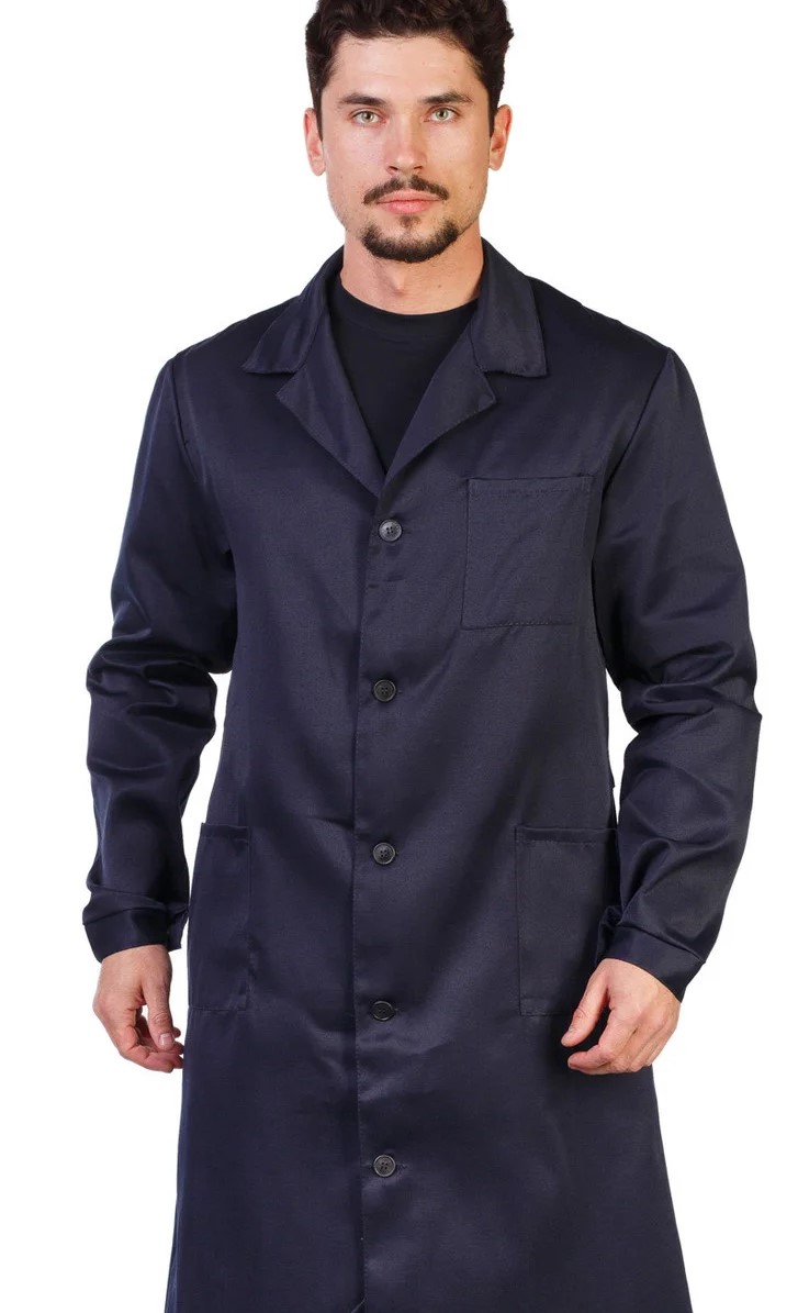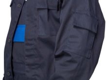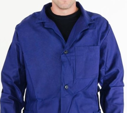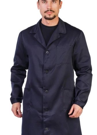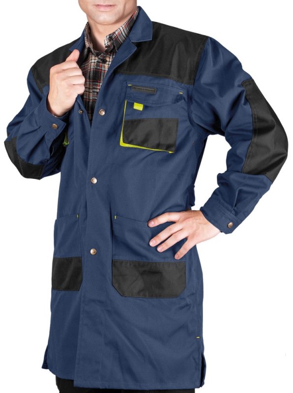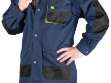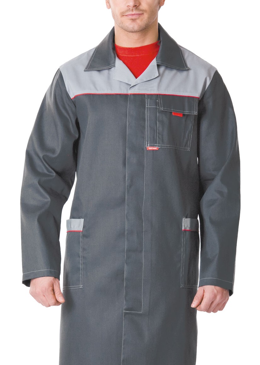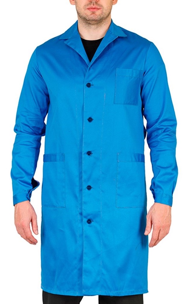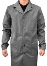 Търговските работници, товарачите се предлагат с технологични халати, ушит от смесен материал, който дава минимално свиване, богата синя цветова гама с ярки синьо-сини вложки на гърба и в областта на джобовете. Линията на игото е украсена с тръба, която отразява светлинните лъчи. Това е изрязан халат с прав силует, закопчан с копчета. Има джобове отдолу и един на гърдите.
