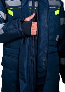 - В такива продукти трябва да присъстват допълнителни полезни елементи. Те включват защитни клапани (включително тези за дихателната система), изолирана яка, здрава качулка, регулировки в долната част на якета и панталони и гривни. Ако работата се планира при замръзване, чиято продължителност е повече от 2 часа, има смисъл да се обърне внимание на внимателни модели, оборудвани с вграден инфрачервен нагревател. Подобни стелки също ще ви бъдат полезни.