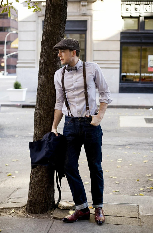 Това е по -оригинално изображение, което обаче ще подхожда на много хора. Дънките с тиранти изглеждат страхотно. Те могат да бъдат допълнени с лека риза с запретнати ръкави. Не е задължително да е бяло. Модерна пеперуда и оригинална барета ще изглеждат органично в това изображение. Ботушите допълват външния вид. Модата вече не ви задължава да ги вземете, за да съответстват на аксесоарите, така че можете спокойно да се спрете на кафяви лачени ботуши.