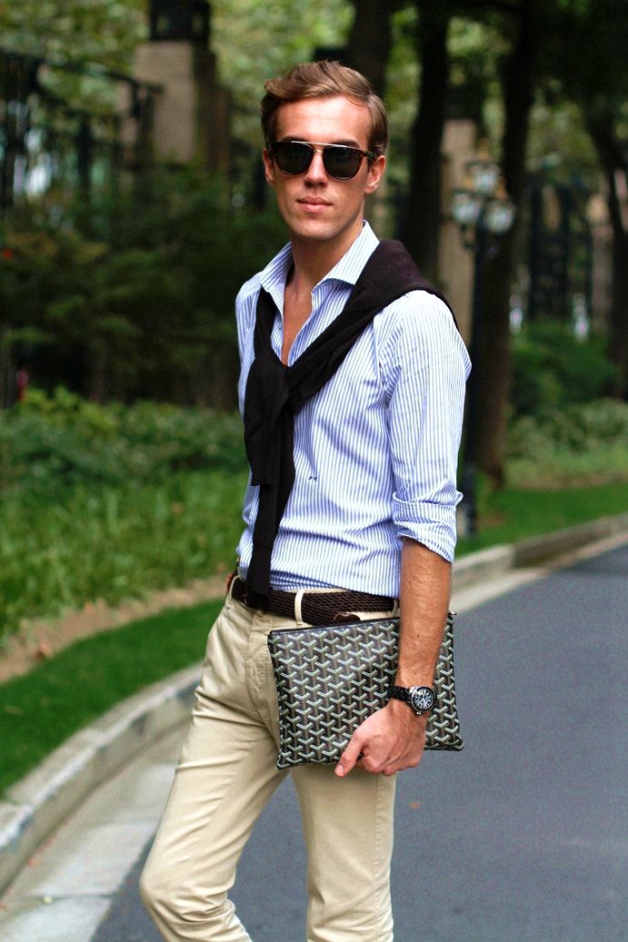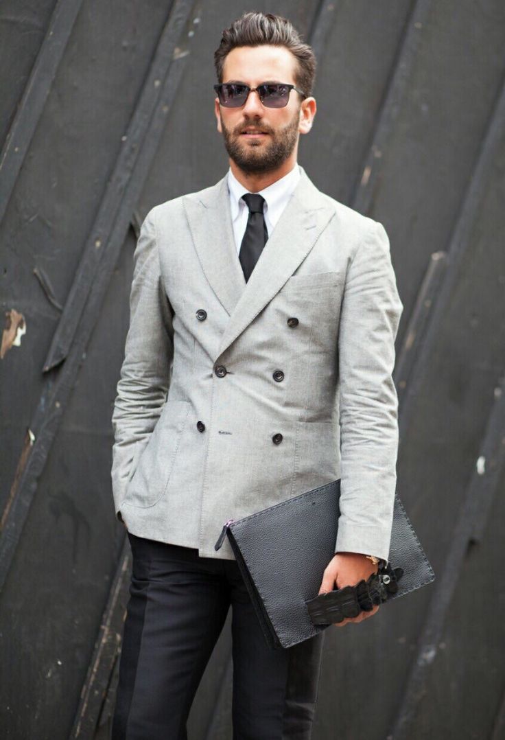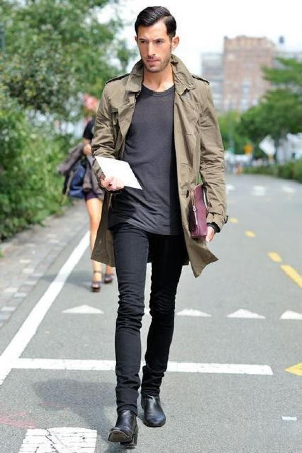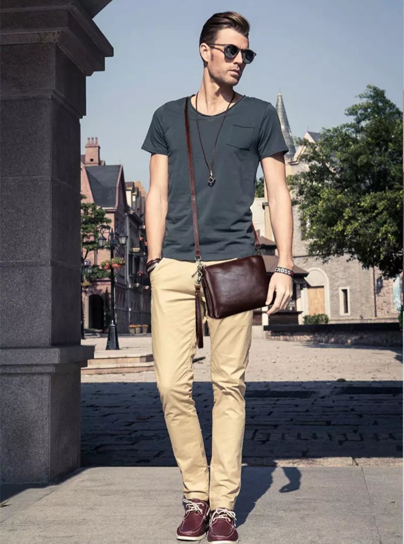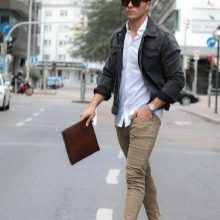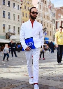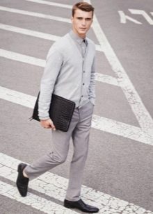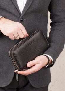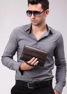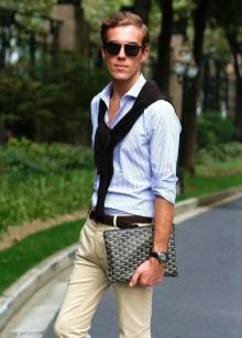Когато избирате какво да комбинирате с модерен мъжки клъч, важно е да обърнете внимание на ежедневни артикули или лаконичен бизнес облик. Най -простото решение е свободно яке или палто, прави или тесни дънки, обемно шумозаглушаване или шал. Монохроматичен съединител с презрамка допълва спортния вид. Голям плосък органайзер или компактна версия на мъжка чанта с традиционна кройка с примка на шевната страна на продукта ще подхожда на бизнес костюм.