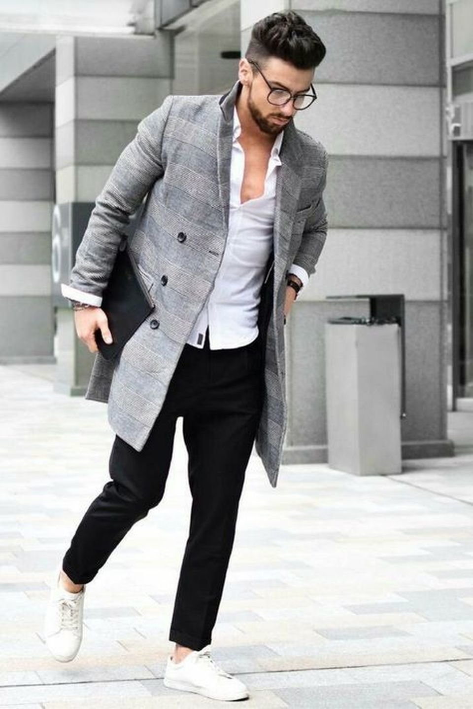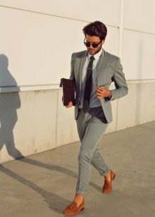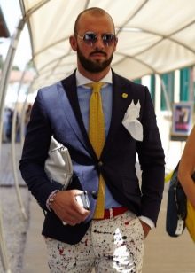 - Ефективна комбинация, постигната поради разликата в текстурите. Грубият плат на якето, подгъвът на панталона, лаконична бяла риза и колан от гладка кожа с прикрепен към него съединител.Идеален вид за уважаван бизнесмен или успешен лидер.