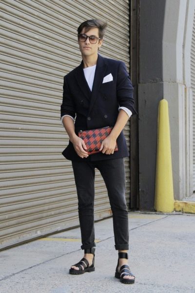 - Стилен младежки облик е лесен за създаване, ако изберете ярка чанта-клъч с обикновен лък с бял дълъг ръкав, двуредно яке, удължено надолу, тесни дънки и сандали. Тъмните очила в масивни рамки допълват визията.