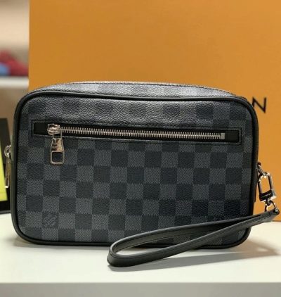 Моден мъжки съединител с оригинален дизайн и удобна организация на вътрешното пространство. В него е удобно да носите най -необходимото, има много отделения вътре за съхранението им. Можете да носите аксесоара в дланта на ръката си или на китката на китката, като преминете ръката си през нея. Подписът в шахматна дъска на платно Damier Graphite изглежда много оригинален в тази рамка.