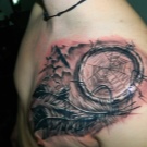 - Много често мъжете поставят това изображение на рамото си. И има достатъчно място, за да изберете подходящия вид татуировка и ако желаете, можете да скриете картината или, обратно, да я покажете. Татуировките, допълнени от образа на животни, изглеждат особено добре: подчертават мъжествеността на собственика си. В същото време е много добре мъжът също да изглежда доста брутален.