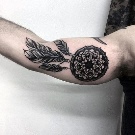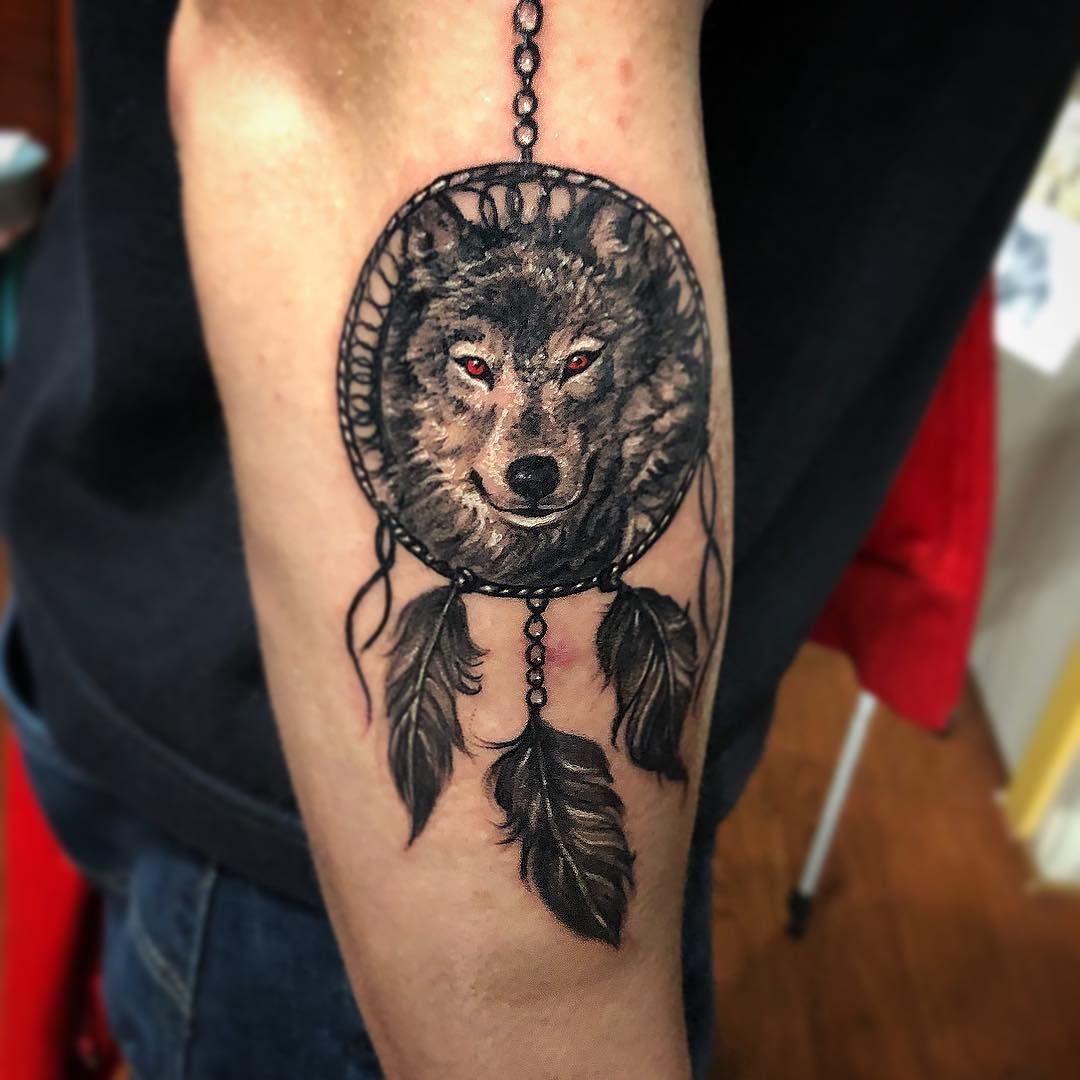- Тези, които избират целия ръкав за изображениетоАз, имам възможност да допълня ловеца на сънища с различни елементи - да изобразя например вълк или бухал, естествен пейзаж вътре в пръстен, растения и цветя. Тези татуировки изглеждат най -добре в цвят.