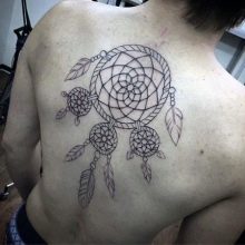 - Гърбът е прекрасно платно за създаване на татуировка. Ловецът на мечти в този случай може да бъде допълнен с различни елементи.