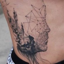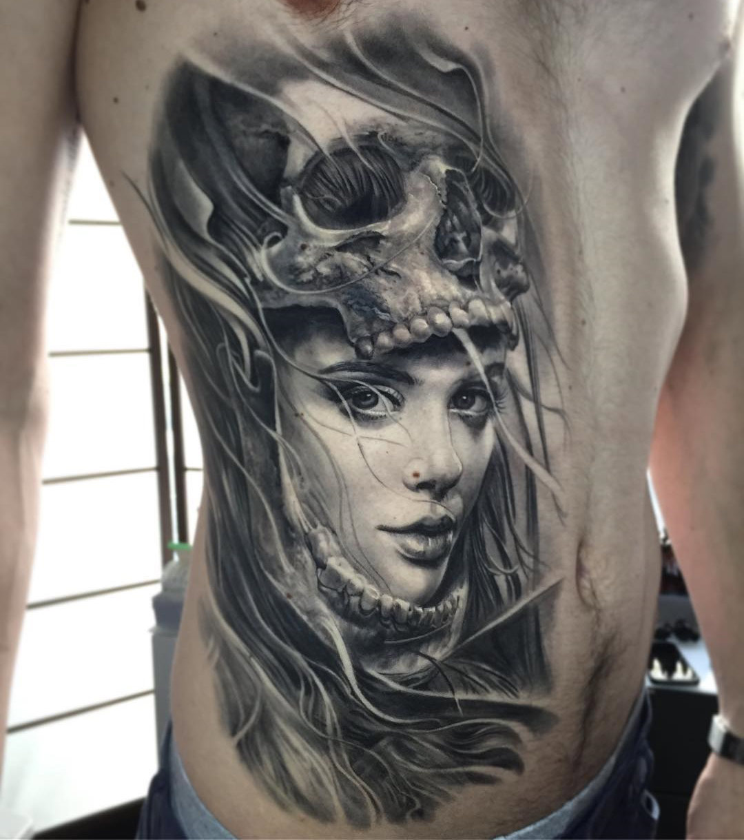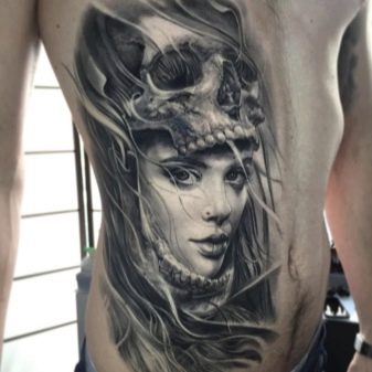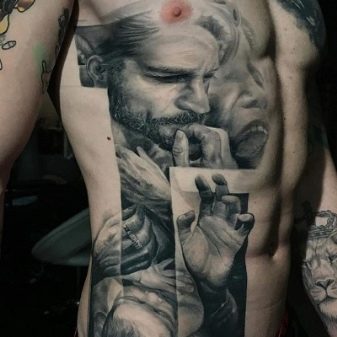 - Портрети... Любителите на реализма могат да изпълнят отстрани обемна рисунка, изобразяваща любим човек или идол. Такива татуировки имат специално значение, защото винаги напомнят на собственика си за някой важен. Можете дори да направите такива рисунки в черно и бяло.