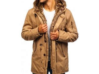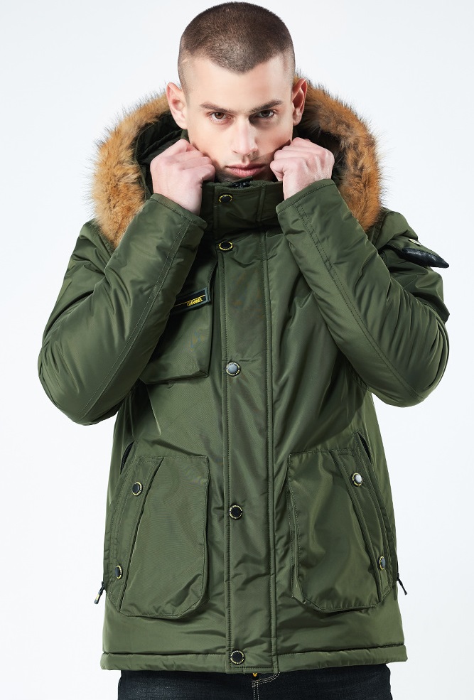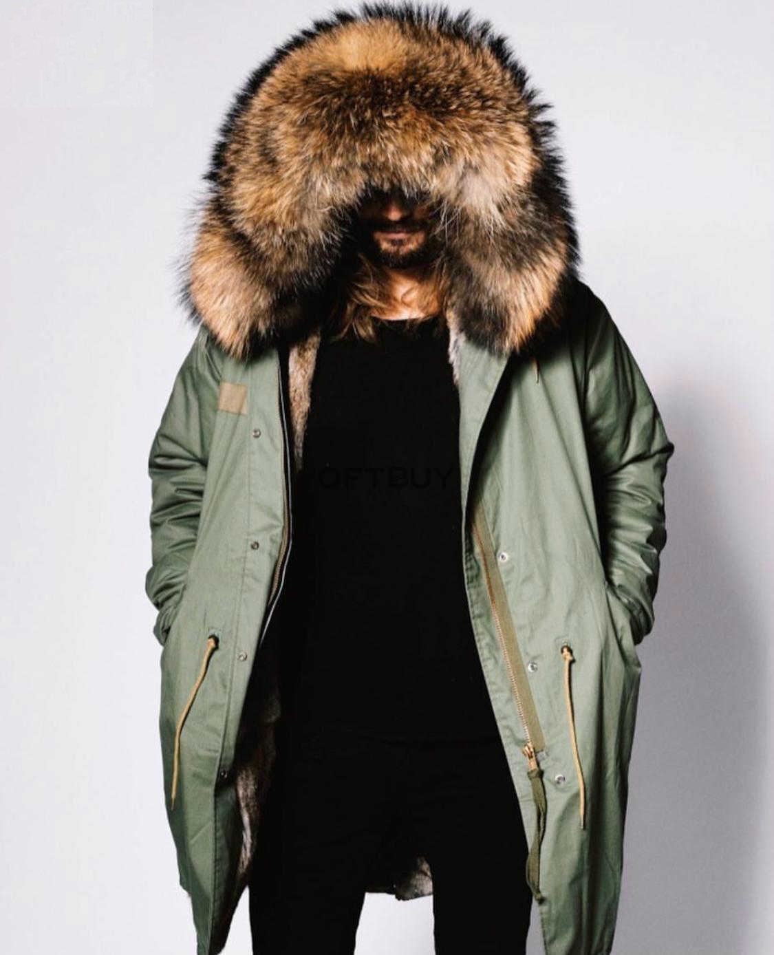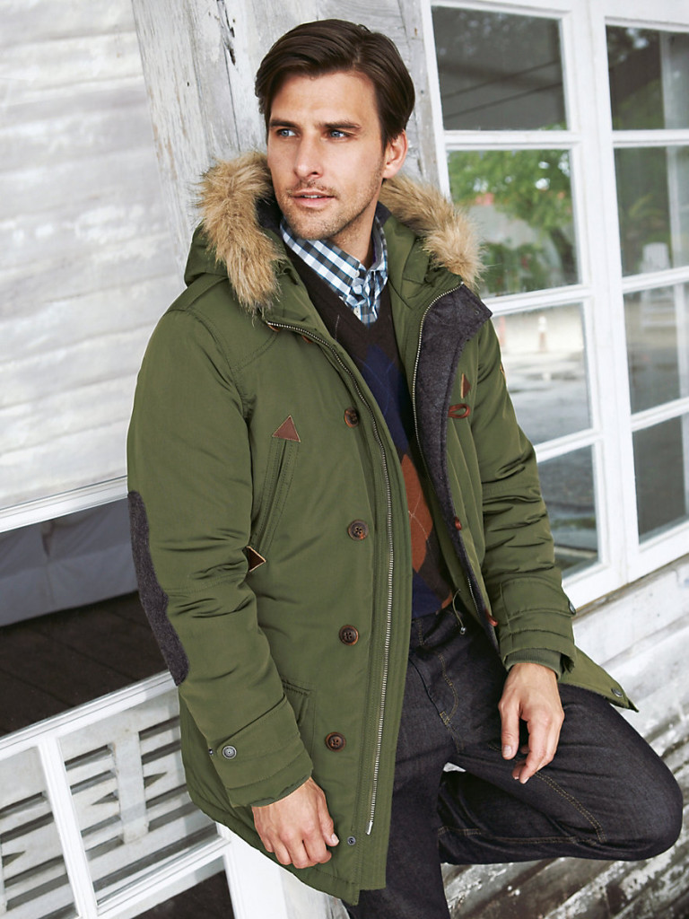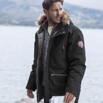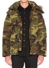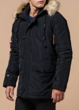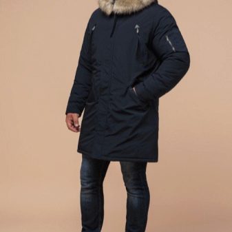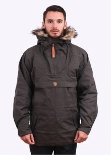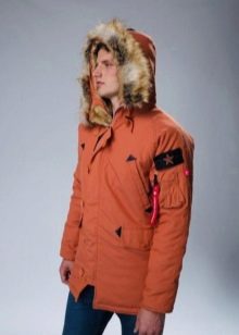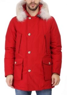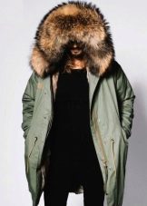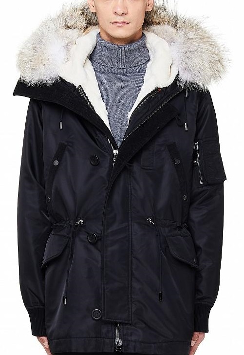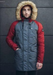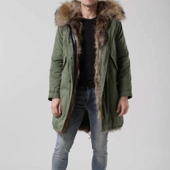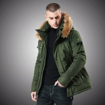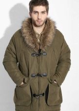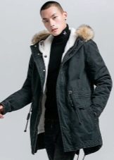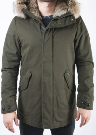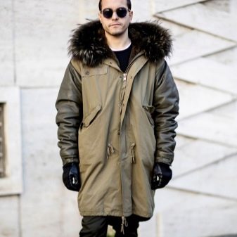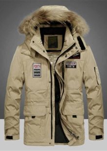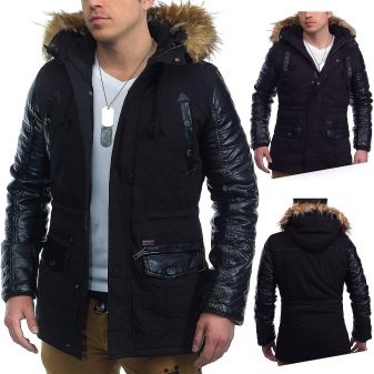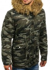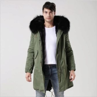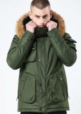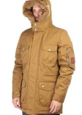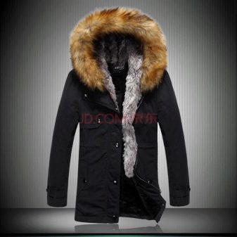 За да се предпазите максимално, на главата се поставя качулка с козина... Заслужава да се отбележи, че тенденцията на козината в декоративния дизайн добави специална индивидуалност към парковете. Тапицерията на качулката е изработена от вълча кожа, койот, миеща мечка или козина от лисица. Кожена яка позволява на мъжа не само да добави чар към изображението, но и да се затопли при минусови температури. В същото време модата за пухкава козина по никакъв начин не повлия на използването на изрязани вълнени дрехи, сред които заешката кожа е много популярна.