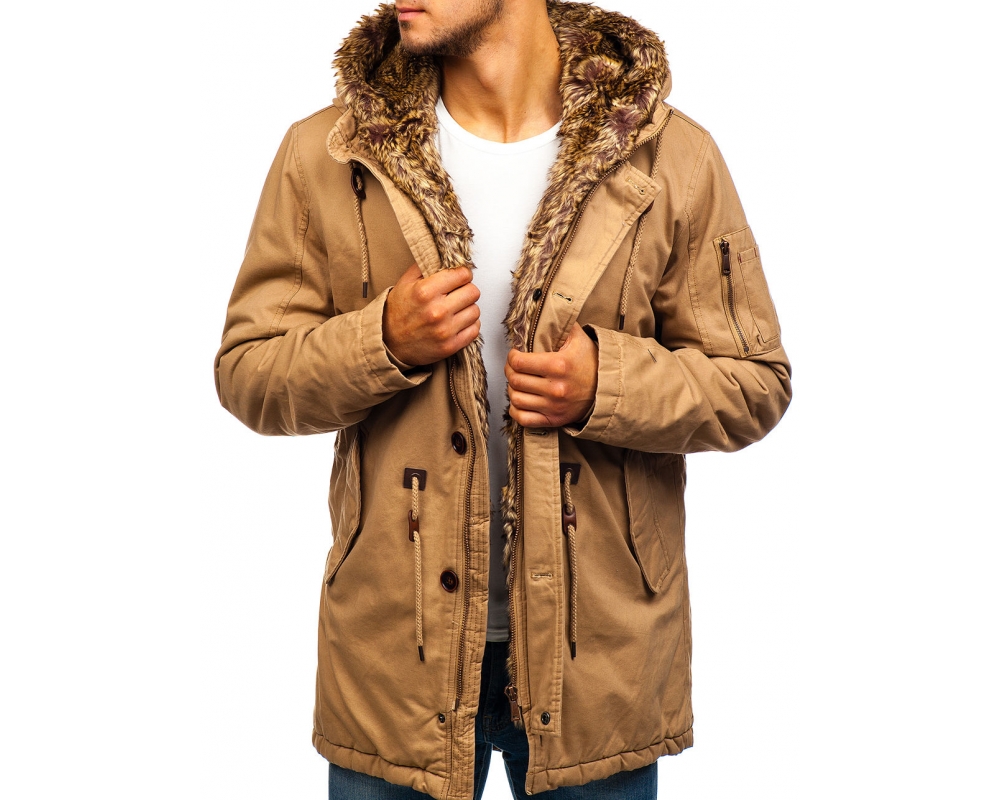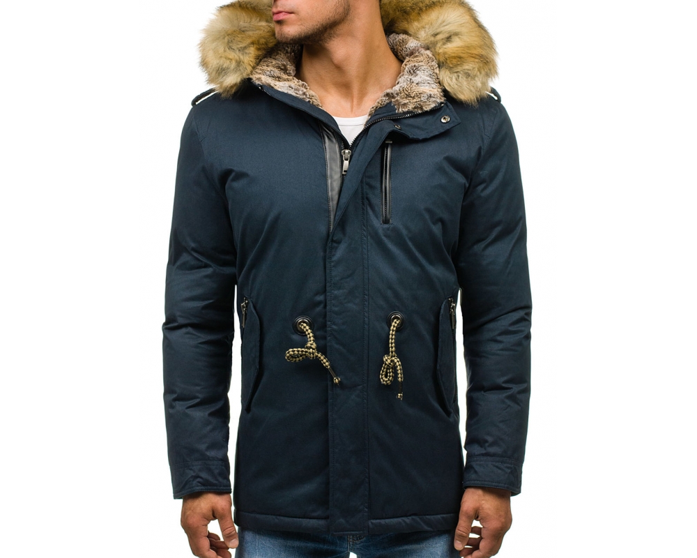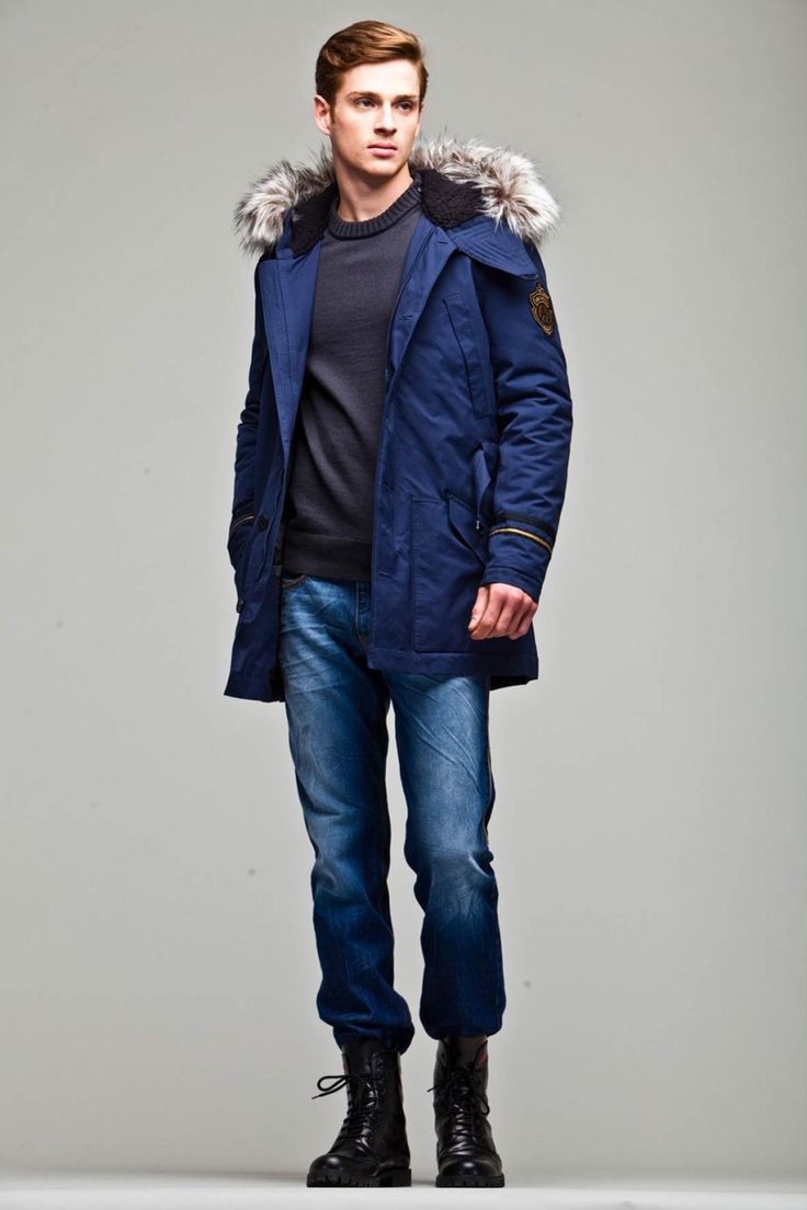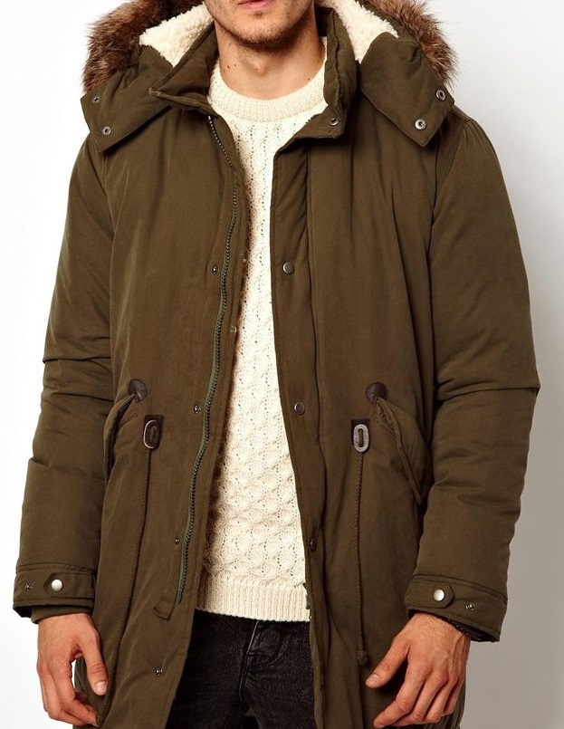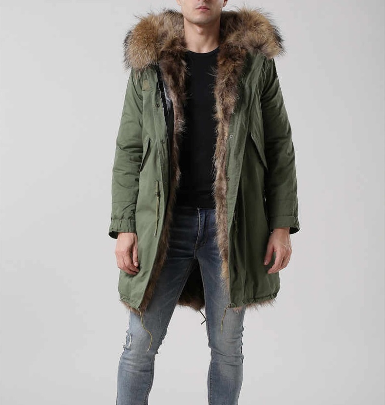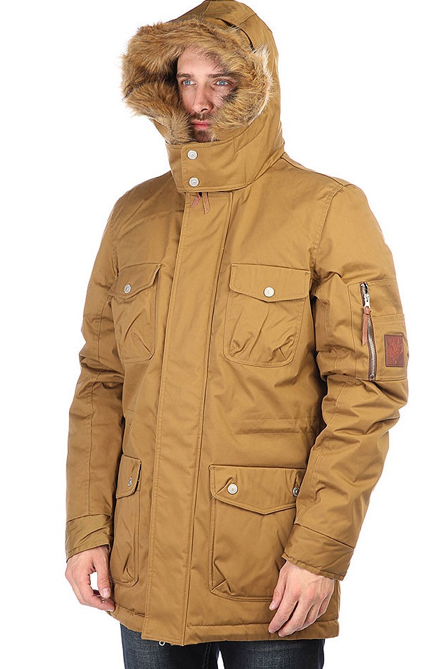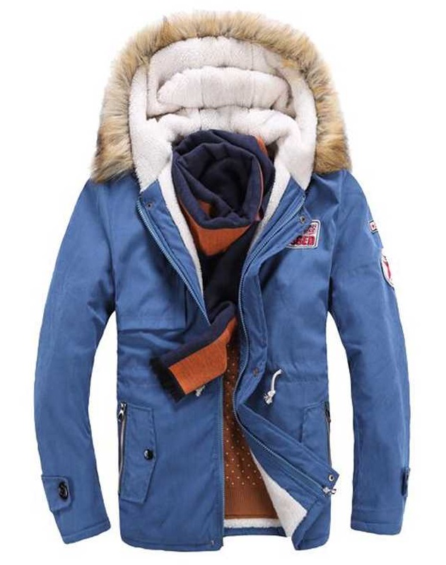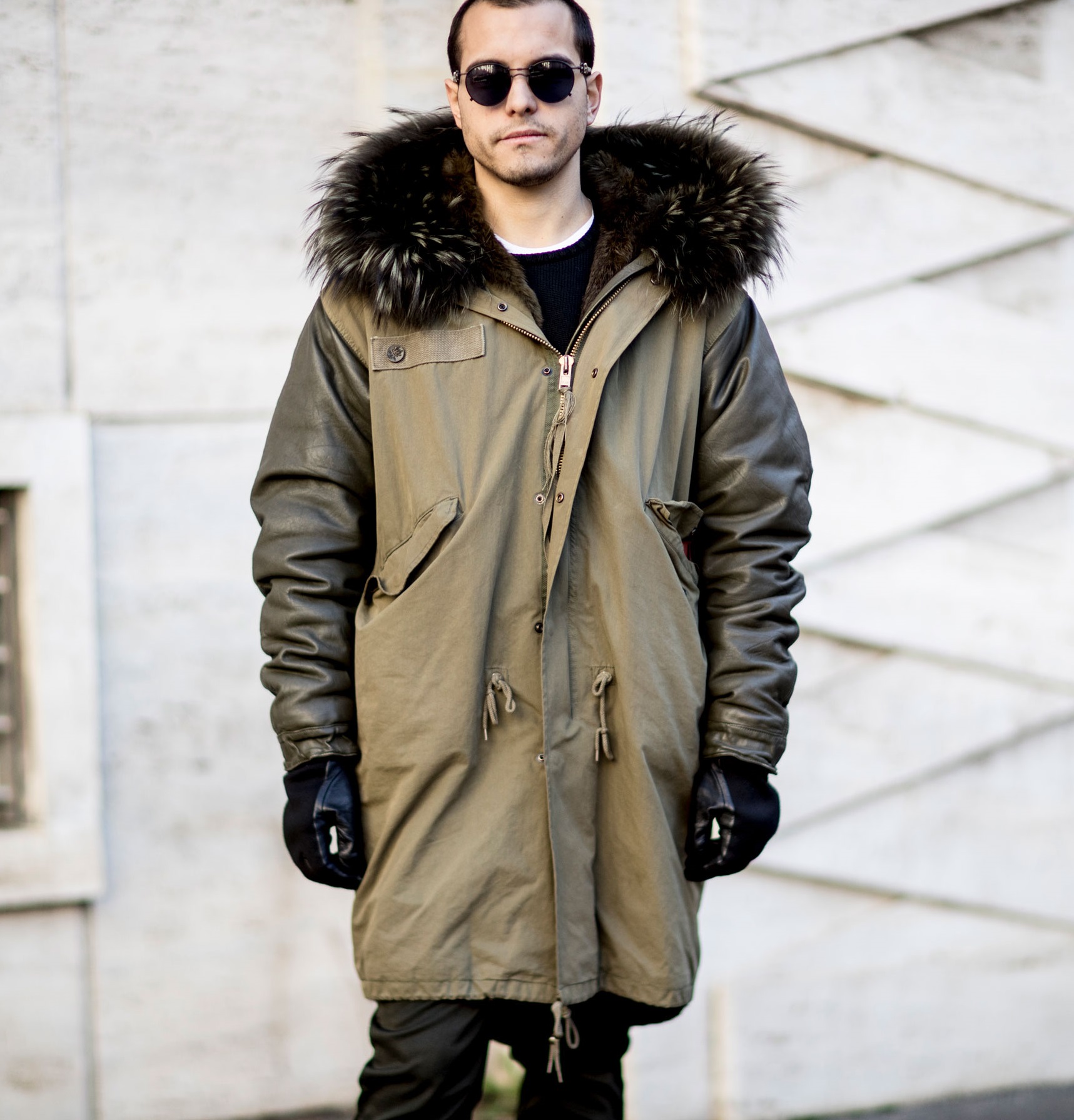 За да се предпазите максимално, на главата се поставя качулка с козина... Заслужава да се отбележи, че тенденцията на козината в декоративния дизайн добави специална индивидуалност към парковете. Тапицерията на качулката е изработена от вълча кожа, койот, миеща мечка или козина от лисица. Кожена яка позволява на мъжа не само да добави чар към изображението, но и да се затопли при минусови температури. В същото време модата за пухкава козина по никакъв начин не повлия на използването на изрязани вълнени дрехи, сред които заешката кожа е много популярна.