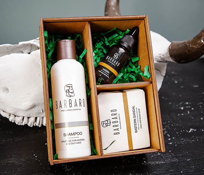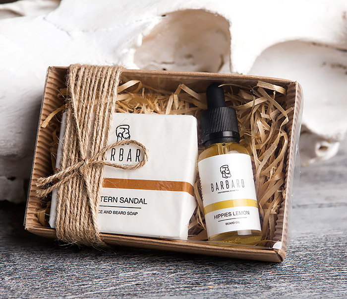 - Barbaro. Cette marque produit des combinaisons de haute qualité de produits efficaces pour le soin de la barbe et de la moustache. Il existe également des coffrets cadeaux dans l'assortiment de Barbaro. Par exemple, un ensemble dans une boîte en carton minimaliste attachée avec un garrot est très populaire. Les produits de soins sont empilés sur des particules semblables à de la paille. Le produit est peu coûteux et se compose d'huile de santal, de baume et de savon.