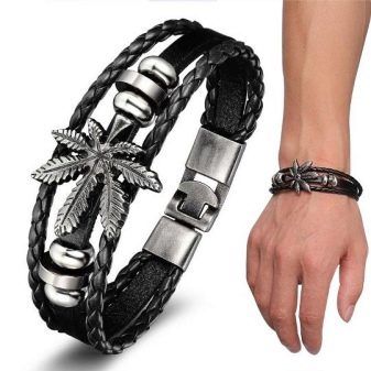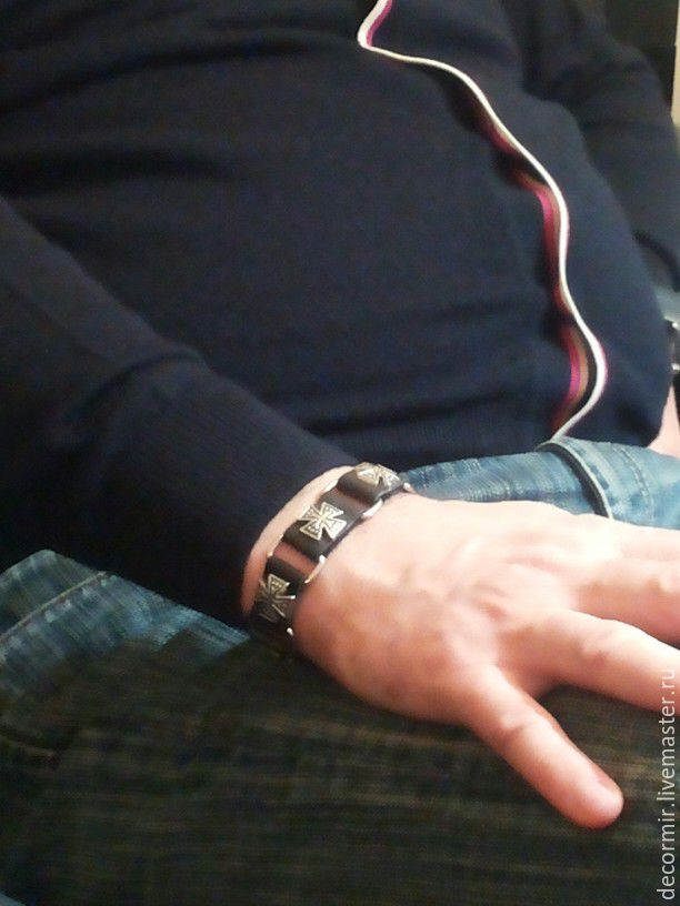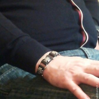 La combinaison du cuir et du métal est peut-être l'une des options masculines du produit. Le fermoir d'un bracelet en cuir, les éventuels inserts, décors ou petits pendentifs peuvent être en métal. Les tendances modernes permettent l'utilisation non seulement de nuances métalliques sombres, mais également d'inserts clairs et même colorés. L'insert métallique peut être gravé, ce qui ajoute à son caractère unique. Le même principe est utilisé pour créer un bracelet orthodoxe avec une croix.