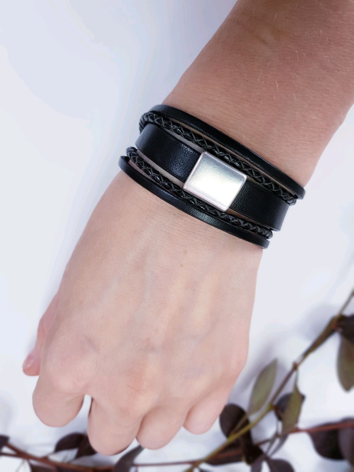 Lorsque vous combinez plusieurs bracelets, assurez-vous qu'ils sont fabriqués dans le même schéma de couleurs et une clé stylistique similaire. Si vous portez le produit avec une montre, vérifiez la compatibilité avec le bracelet de la montre. Les bracelets laconiques en cuir sans décor se marient bien avec des objets simples en argent et en métal.