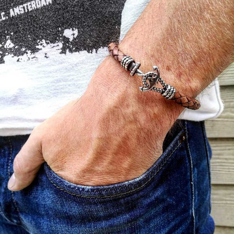 Pour les vacances d'été, vous pouvez choisir des modèles plus lumineux de bracelets en cuir, décorés d'une ancre. L'essentiel est que ce détail ne soit pas trop grand, sinon, en combinaison avec une teinte riche du produit (et il peut être bleu, vert, orange), le détail aura l'air prétentieux. Les meilleurs compagnons pour un tel bracelet sont un jean et un t-shirt, une chemise blanche, un short ou un pantalon ample.