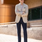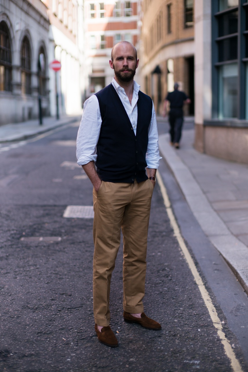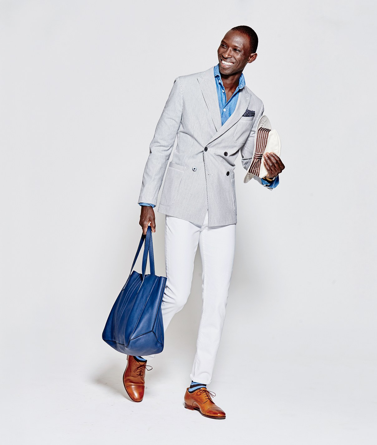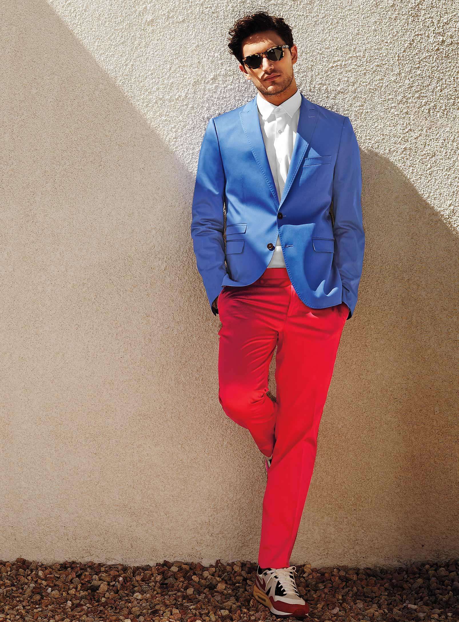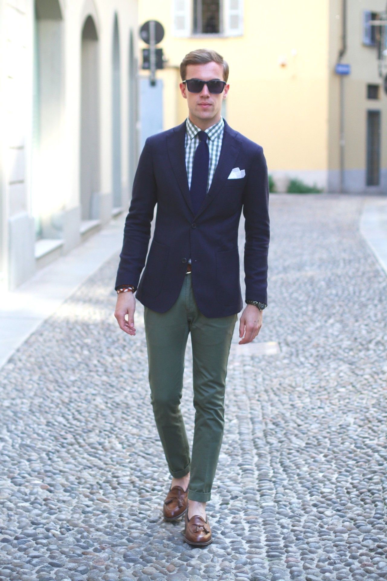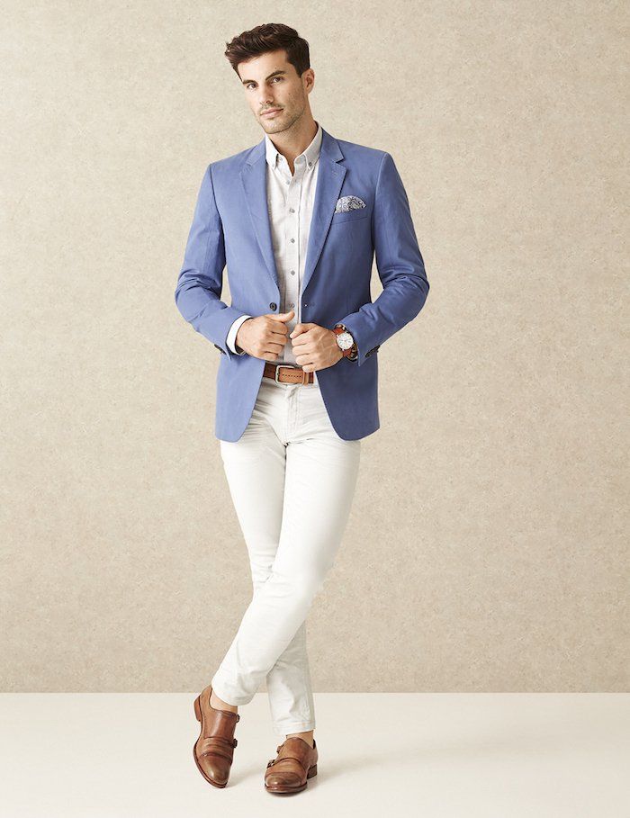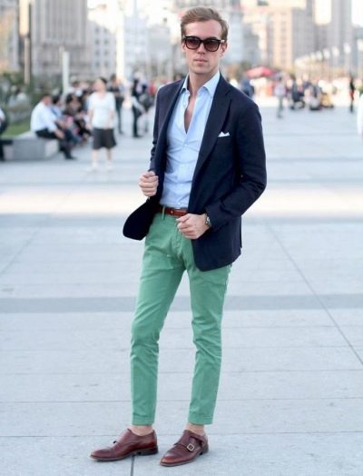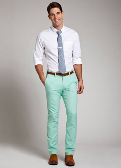 - un pantalon vert menthe, une veste bleue et une chemise bleu clair sont une excellente combinaison pour la vie de tous les jours ;