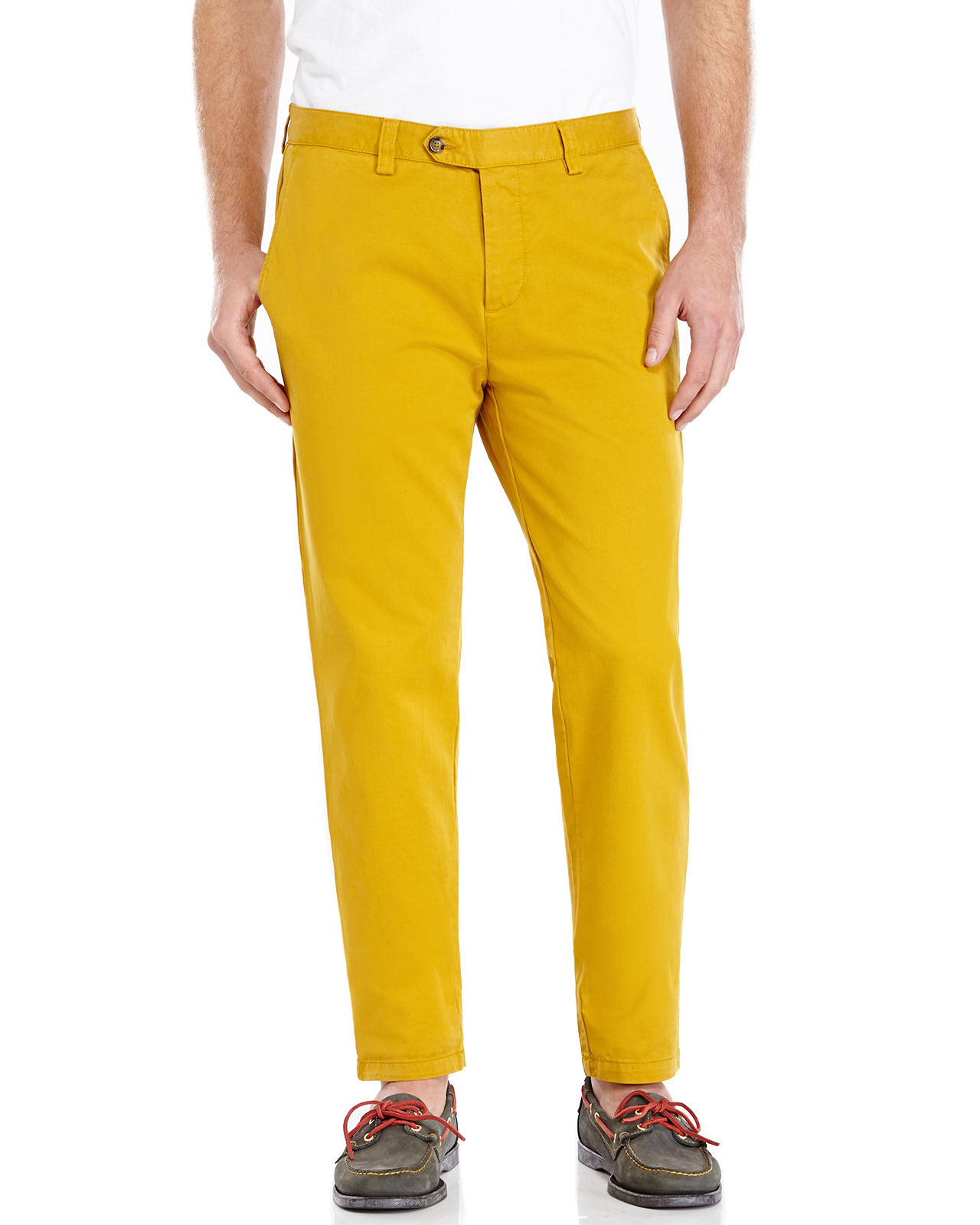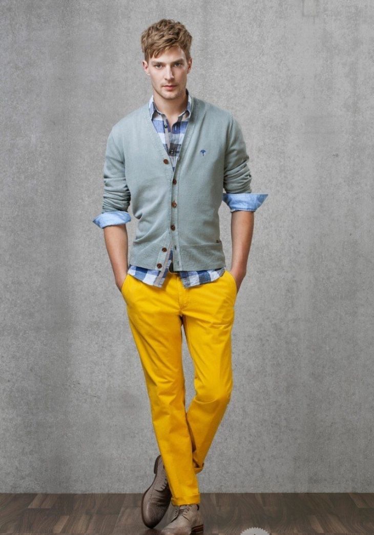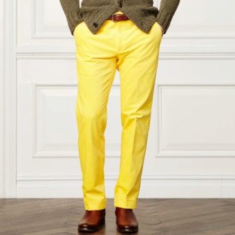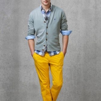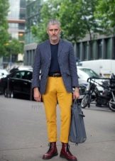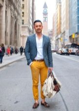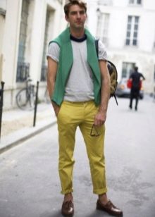 - Jaune. Possibilité été. En hiver, un homme en pantalon jaune peut sembler approprié uniquement sur scène ou au gymnase. Fait intéressant, un ton aussi brillant permet d'expérimenter des styles - les chinos, les pantalons de survêtement fuselés ou les culottes courtes ont fière allure en jaune. Les nuances de jaune vous permettent de varier le degré de luminosité de l'ensemble de l'image - en pantalon jaune pâle, presque blanc, vous pouvez apparaître au bureau par une chaude journée, et en citron, vous pouvez assommer tout le monde avec votre apparence lors d'une fête.
