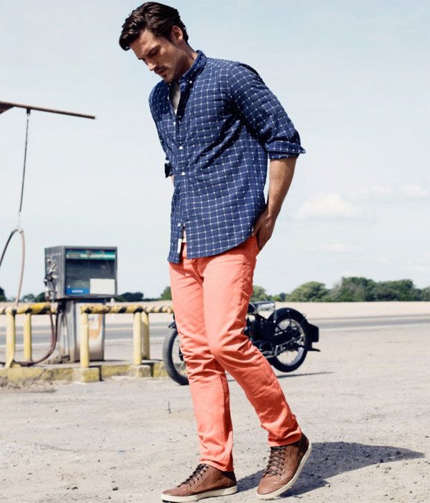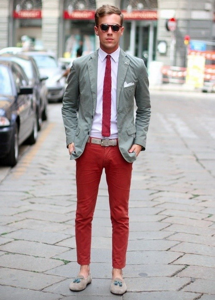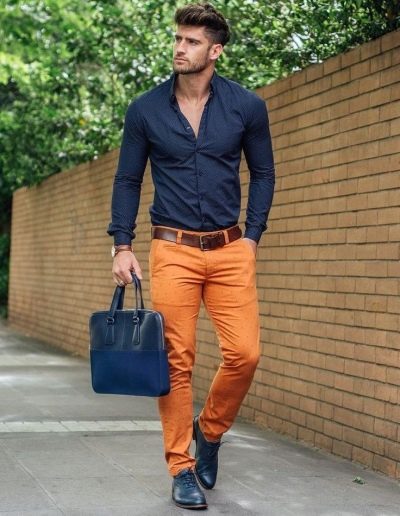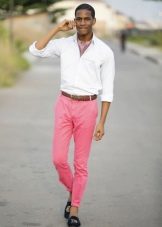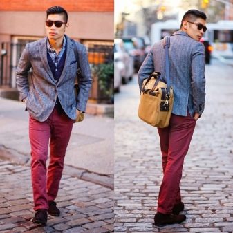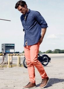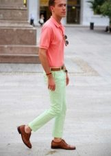 Quant aux pantalons unis couleurs vives, alors ils sont tout à fait adaptés pour visiter le travail ou se réunir dans un café, s'ils ne sont combinés qu'avec des chemises ou un polo. De plus, s'il s'agit de travailler, l'arc doit être modeste, c'est-à-dire qu'un pantalon de couleurs vives doit être le seul point lumineux, le port de vêtements aux nuances flashy est dans ce cas contre-indiqué.