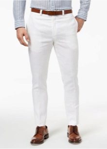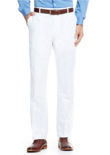- Blanche. Classique de la garde-robe d'été. Les pantalons blancs pour hommes peuvent devenir la base d'un look blanc comme neige. En règle générale, ils sont combinés avec les mêmes chaussures ou chemises de lutte blanches qui répètent la teinte du pantalon ton sur ton. Si un style classique est choisi, le pantalon doit avoir la même coupe classique, les mêmes poches fléchées et fendues. Une veste accompagne très rarement un tel arc, sauf lors d'événements officiels ou d'un mariage. Si des vêtements de sport sont choisis, le pantalon doit correspondre au style. Un survêtement blanc est un excellent choix pour marcher pendant la saison chaude.