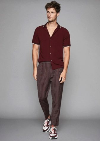 En été, ils ont l'air tout à fait appropriés pantalon cramoisi dans une cage ou une bande, ainsi qu'avec une empreinte d'un concombre chinois ou une inscription d'une marque célèbre. Il est à noter que les looks d'été les plus réussis sont obtenus avec des pantalons multicolores, surtout si la couleur des vêtements du dessus fait écho à l'une des nuances présentes sur le pantalon. Et si le pantalon n'est pas en tissu de costume lourd, mais en lin confortable ou coton léger, alors le choix devient évident - il n'y a pas de meilleure option pour un arc d'été. La même chemise légère ou le même tee-shirt en jersey peuvent le compléter.