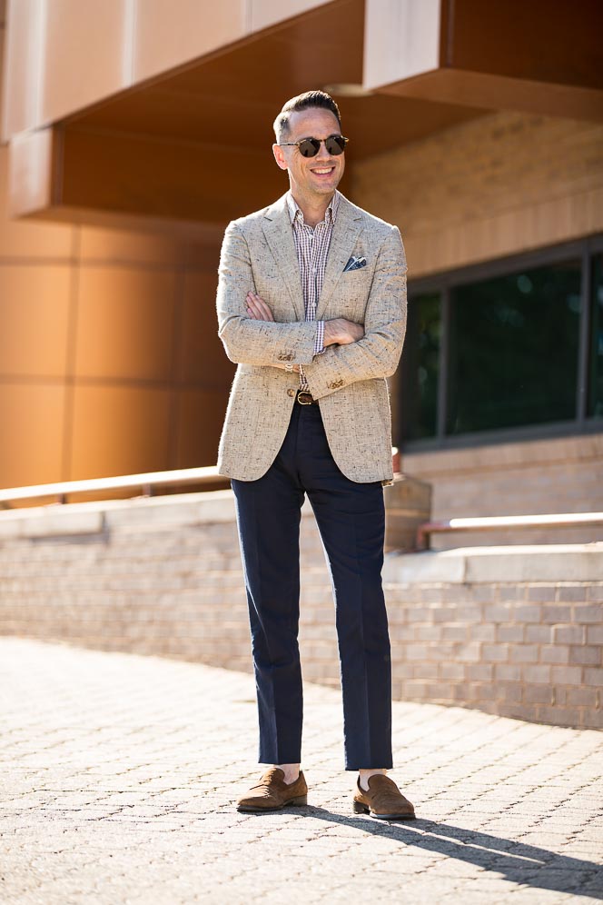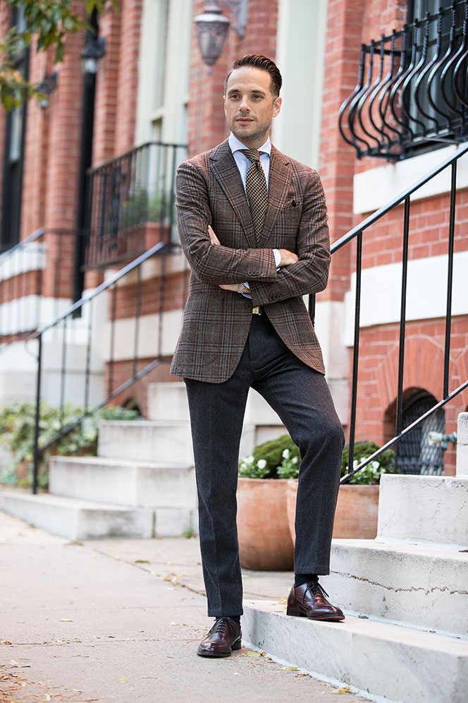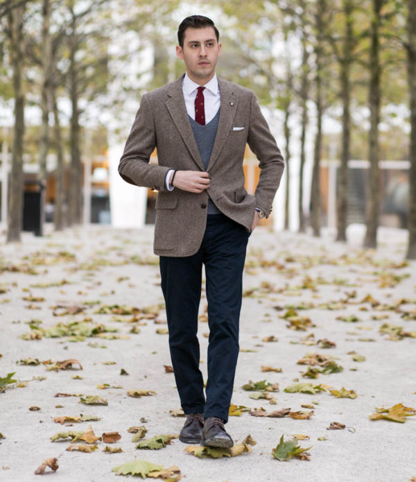 - une cravate à pois fait écho avec succès à la couleur du pantalon ;