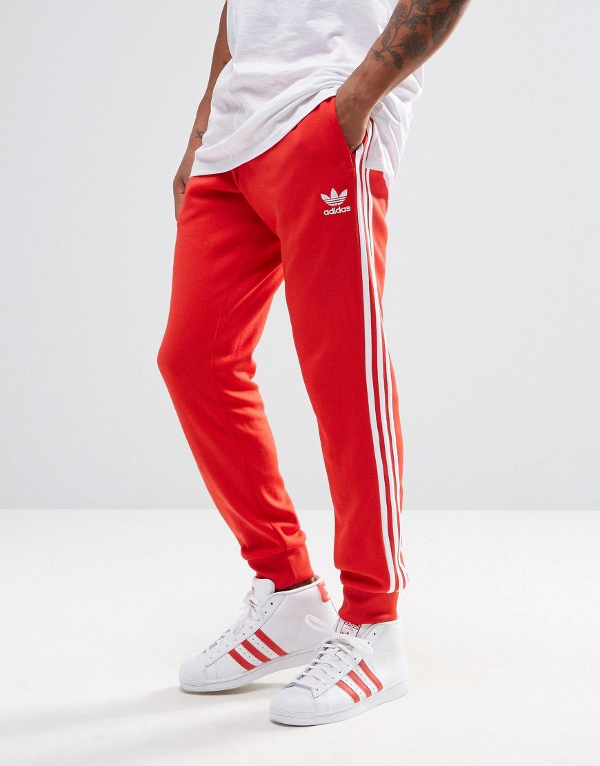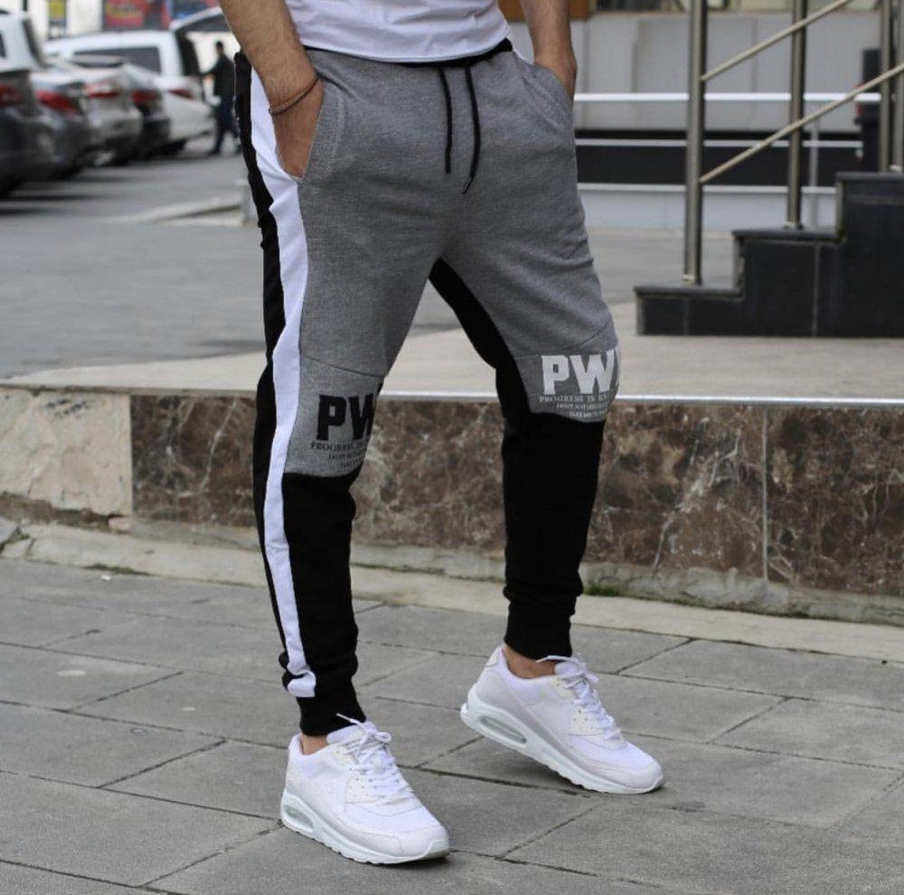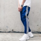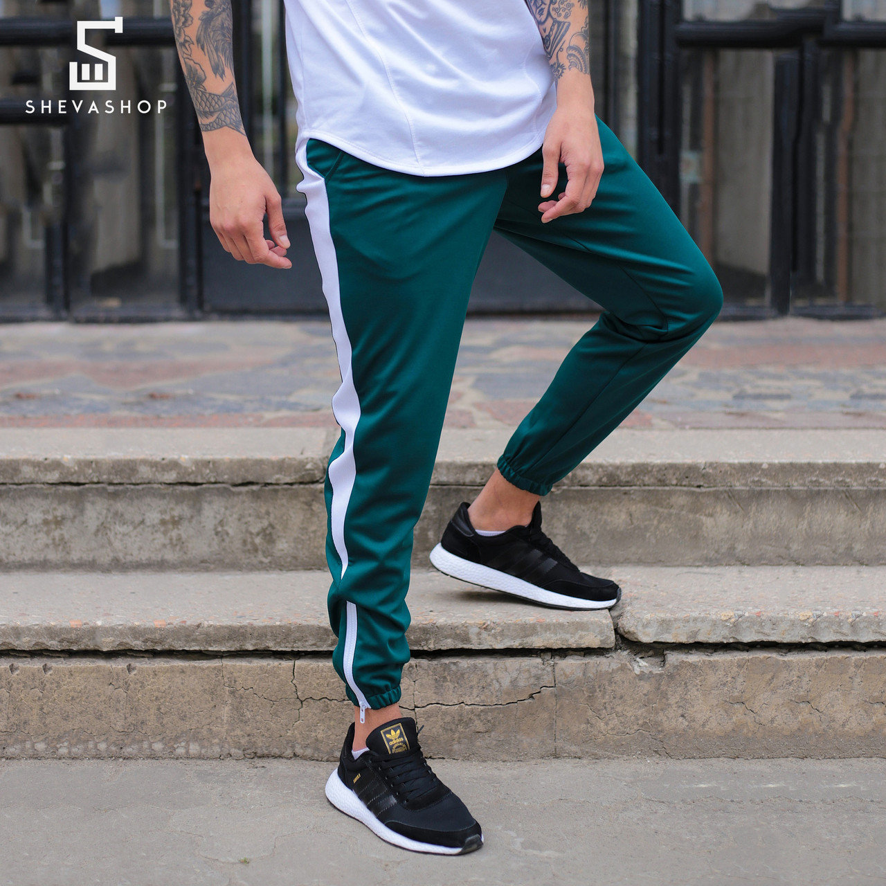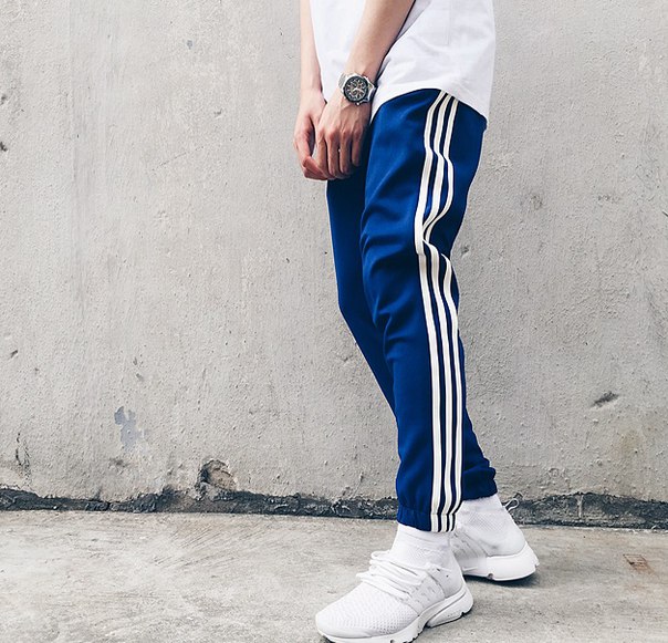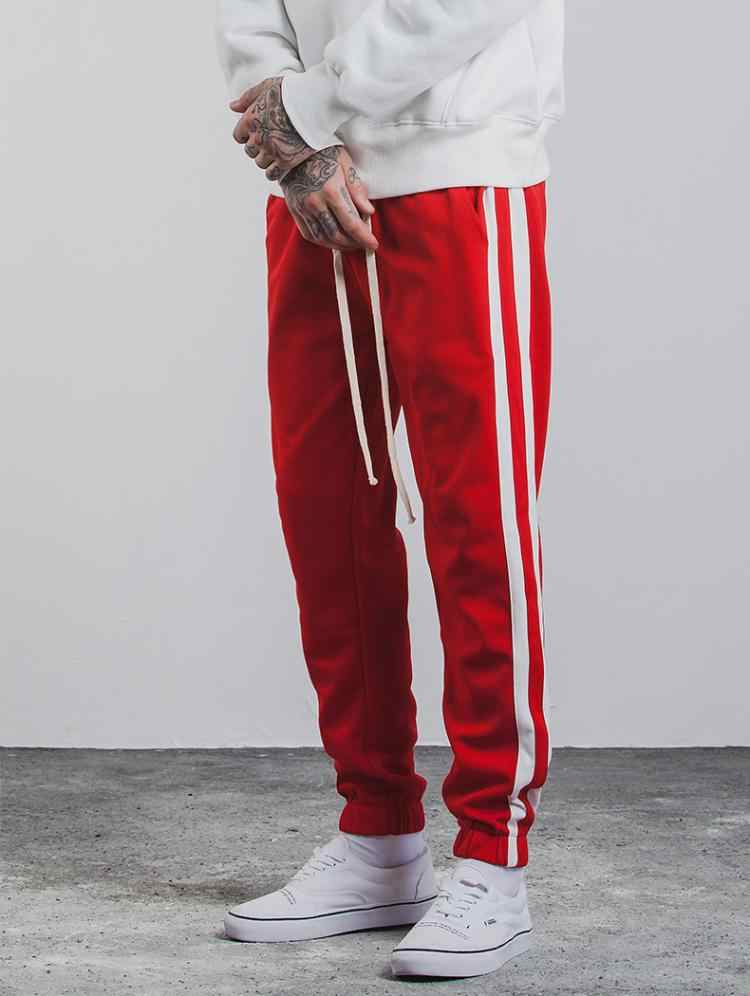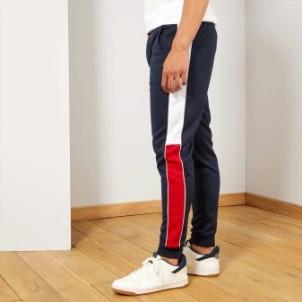 - Les pantalons de survêtement à rayures soulignent parfaitement la grande croissance des hommes.