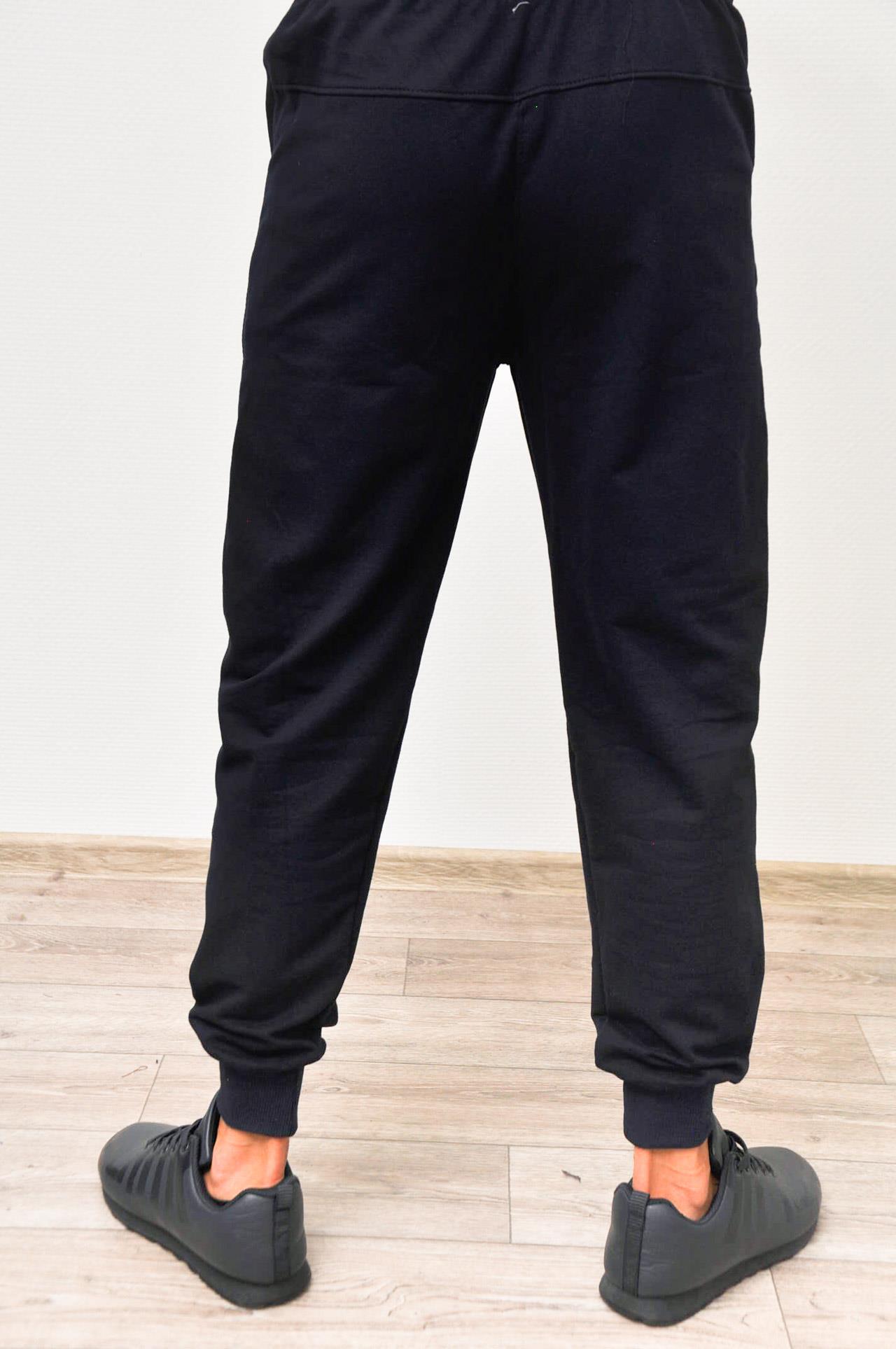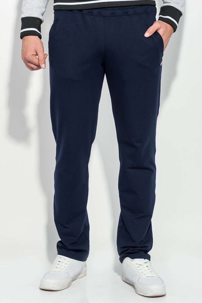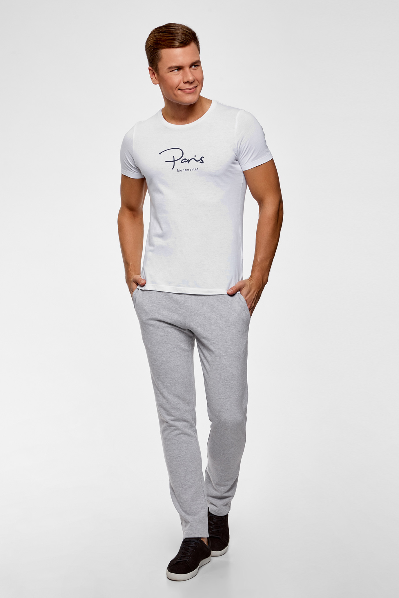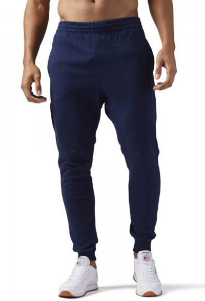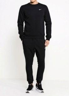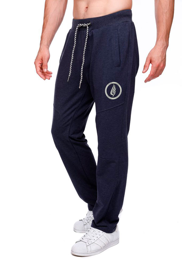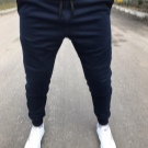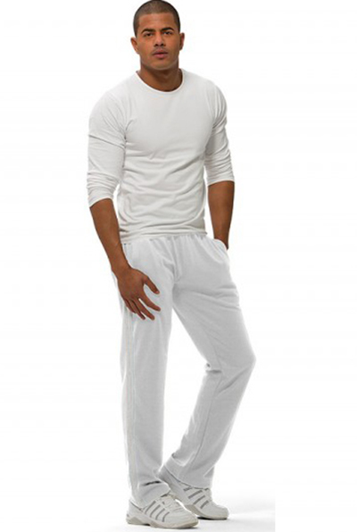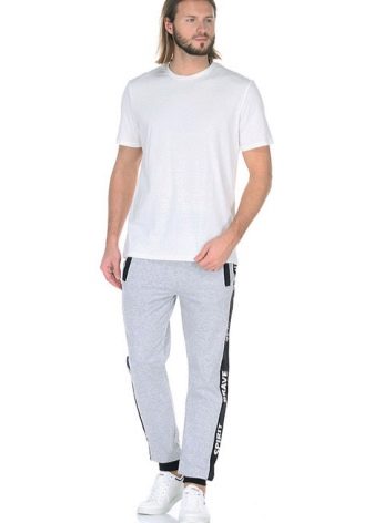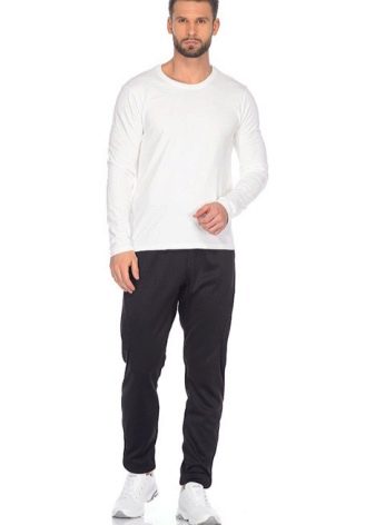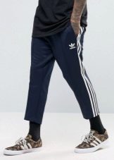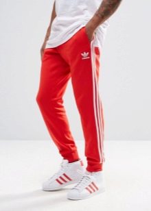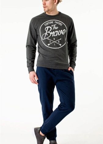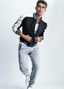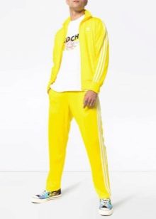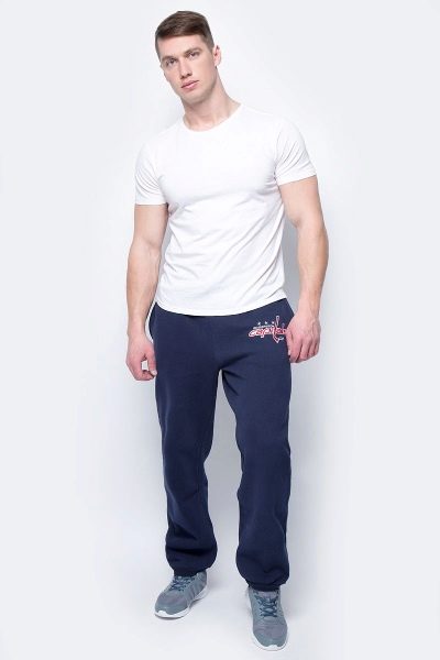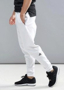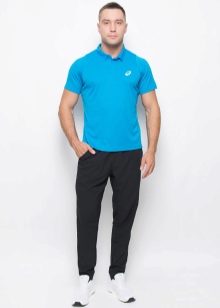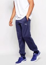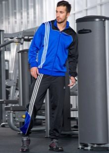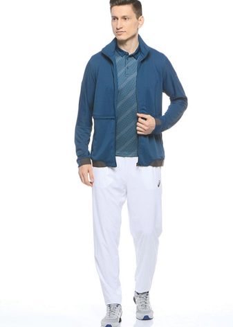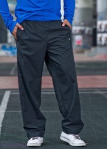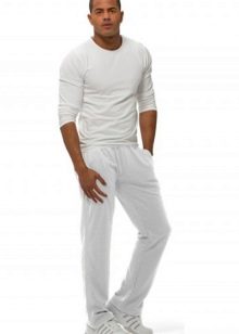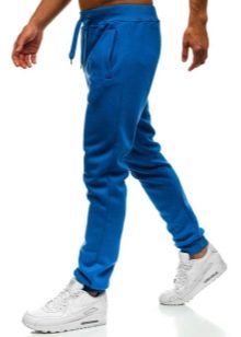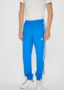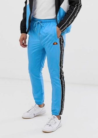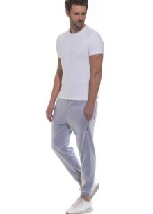 Dans ce cas, un modèle de coupe large classique est présenté. La couleur bleue du pantalon se marie bien avec le tee-shirt blanc. Un attribut obligatoire est les baskets. Assez souvent, ces pantalons sont un ensemble d'un survêtement complet. Cependant, les hommes sont habitués à ce style, c'est pourquoi ils s'y désintéressent beaucoup, mais en vain. C'est dans de telles "munitions" sportives que les représentants du sexe fort peuvent librement faire du sport, même dans le gymnase, même dans la rue.