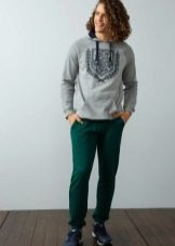 Le but du pantalon de sport est l'entraînement. Cela signifie que les éléments vestimentaires qui leur sont associés sont un T-shirt, un T-shirt et des baskets. Et ici, il est déjà nécessaire de clarifier. Les t-shirts en coton sont mieux portés par temps chaud. Il n'est pas nécessaire qu'elles soient monochromatiques. Vous pouvez également vous concentrer sur les produits imprimés. Selon les créateurs de mode, un nœud sportif est très dynamique, la partie supérieure du vêtement ayant le même ton que la couleur des cheveux ou les inserts décoratifs dans le pantalon.