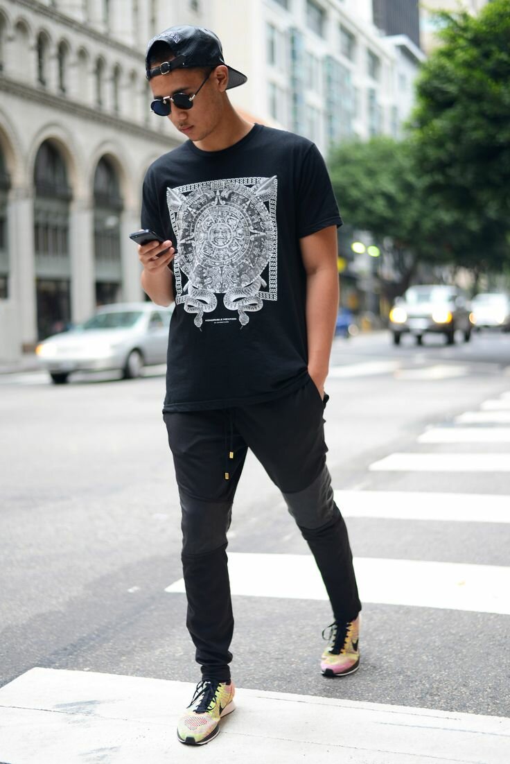 L'arc suivant est préférable pour les jeunes. Les hommes plus âgés ne considèrent même pas ces styles. De nombreuses poches profondes sur les pantalons sont l'un des principaux succès de ces dernières saisons. La palette de couleurs du pantalon dans l'arc présenté appartient à une palette sombre, ce qui signifie qu'il n'est pas difficile de les combiner avec des chaussures sombres et un haut.