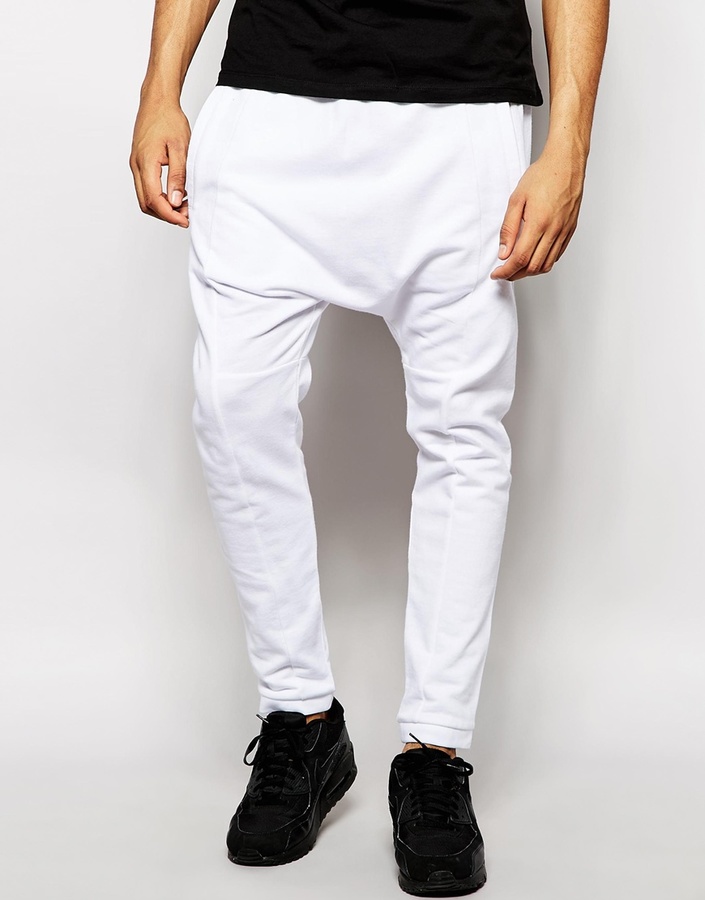 Depuis quelques années, ce type de pantalons de survêtement est à la pointe des tendances de la mode. Au niveau des cuisses, la culotte a une forme volumétrique, puis se rétrécit progressivement vers le bas.