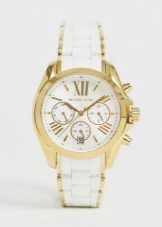 Externe le boîtier du produit est en or et le cadran est en blanc... Le fabricant rapporte que ce modèle peut être porté dans presque toutes les conditions : comme accessoire quotidien, pour la salle de sport ou pour les négociations commerciales. Le boîtier de la montre est en acier revêtu de PVD. La taille du produit est de 4,5 cm et le coût de l'appareil est d'environ 26 000 roubles.
