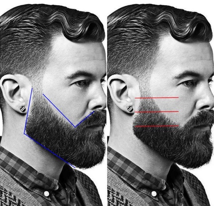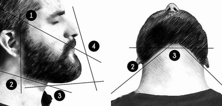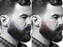 - die Korrektur sollte immer im Wangenbereich beginnen, und Friseure empfehlen auch, überschüssige Haare am Hals zu entfernen, da die Haare in diesen Bereichen anfälliger für die Verarbeitung sind, dann werden der Schnurrbart und die Seitenteile getrimmt; die Bereiche der Schläfen sind sehr sorgfältig ausgearbeitet, da sie das Gesicht optisch breiter und schmaler machen können - hier hängt der Erfolg von den richtig gewählten Konturen des Bartes ab;