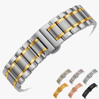 - Stahl. Eine der praktischsten Optionen. Stahl hat eine gute Verschleiß- und Kratzfestigkeit und behält bei richtiger Pflege lange Zeit ein ansehnliches Aussehen. Außerdem ist ein Stahlarmband günstiger als Gold oder Silber. Ein wesentlicher Nachteil ist ein spürbares Gewicht, das für aktive Übungen unpraktisch ist.