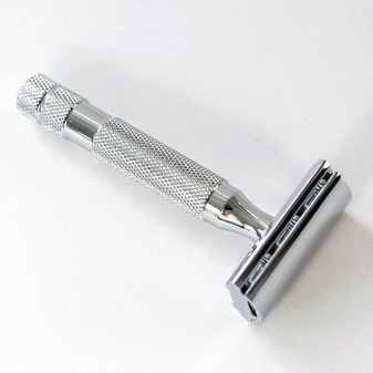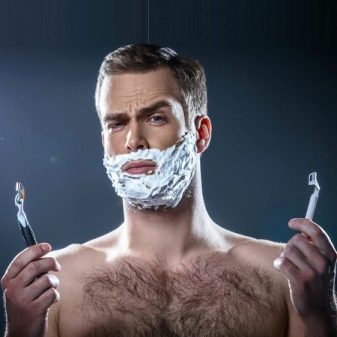 Produkte mit offenem Schnitt und Rändelkopf am besten zum Abrasieren dicker Stoppeln - dieses Zubehör trennt die Haare und rasiert sie leicht. Schräge Modelle Sie können Haare an den Wurzeln abrasieren, aber ihre Verwendung erfordert Geschick - bei unbeholfenen Bewegungen können Sie die Haut verletzen. Hersteller bieten auch an Rasiermesser mit einem feuchtigkeitsspendenden Gelstreifen. Es erleichtert das Gleiten, sättigt die Haut mit Nährstoffen. Diese Produkte werden für Menschen mit trockenem oder empfindlichem Hauttyp empfohlen. Und auch Maschinen sind ein-, zweischneidig, seltener - mit drei Klingen.