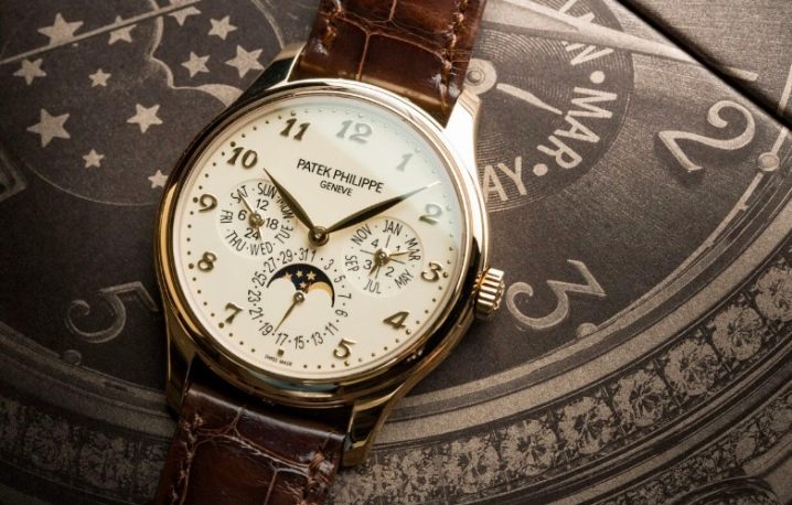 - Patek Philippe 5327J. Ein klassisches Modell einer mechanischen Uhr mit automatischem Aufzug auf einem Lederarmband. Das Armband ist aus echtem Leder, das Gehäuse aus Gelbgold. Der Mechanismus hat einen eingebauten ewigen Mondkalender. Das Modell zeichnet sich durch seine Präzision und Langlebigkeit aus Glas aus. Die Uhr wird von Hand gefertigt, die Details sind fein ausgearbeitet.