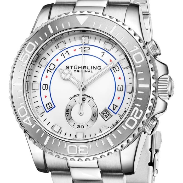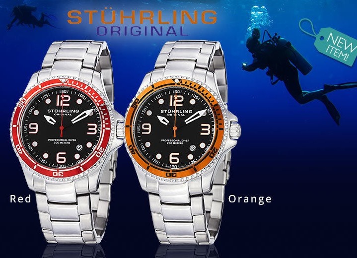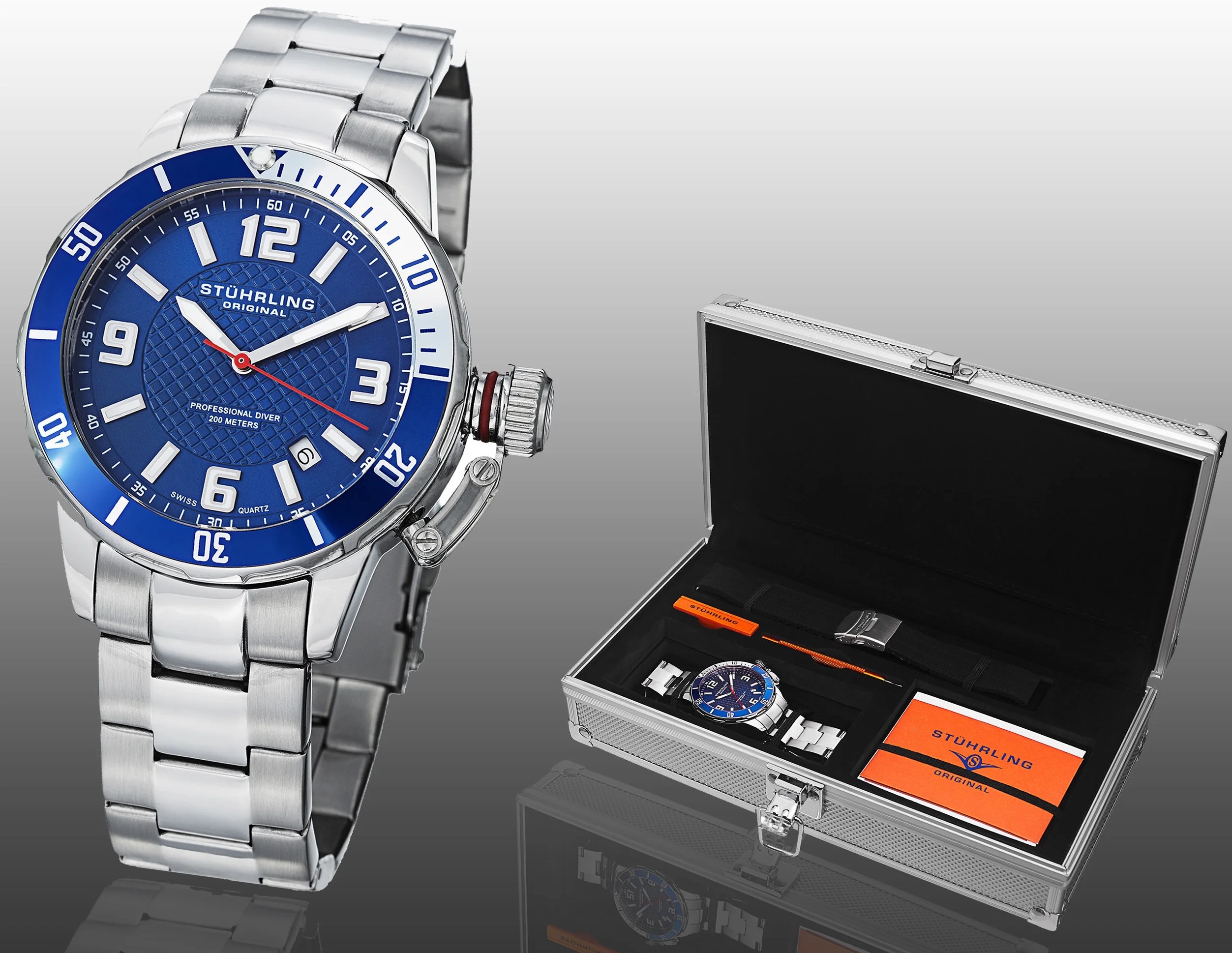 Eine der meistverkauften Stuhrling-Kollektionen - Aquadiver Stuhrling Taucheruhr, Wasserdichtigkeit davon 200 Meter. Ausgestattet sind sie mit einer verschraubten Krone, die einen wasserdichten Verschluss bildet und das Eindringen von Wasser verhindert, und dem Schweizer Uhrwerk Ronda 515. Es ist ideal für alle, die eine High-End-Uhr zu einem vernünftigen Preis kaufen möchten.