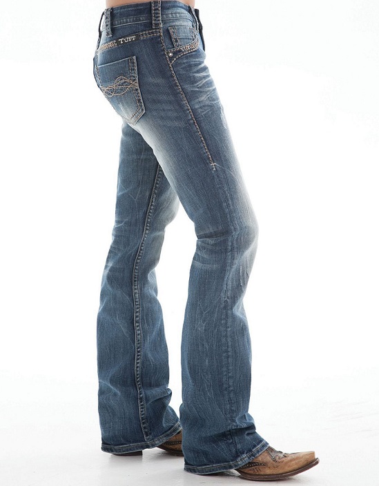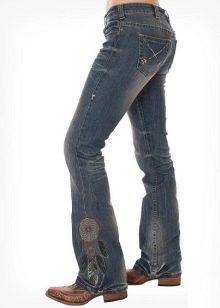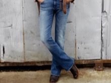 Dies sind die Eigenschaften, die echte Bootcut-Jeans ausmachen. Darüber hinaus ermöglichen sie die Verwendung verschiedener Elemente moderner Einrichtung: Alterung, Bildung von Abrieb und Rissstellen, die Verwendung von Ledereinsätzen oder kontrastierenden Aufnähern im Military-Stil. Aber echte Fashionistas bevorzugen klassische One-Piece-Jeans, die ab dem Knie ausgestellt sind.