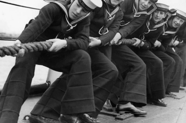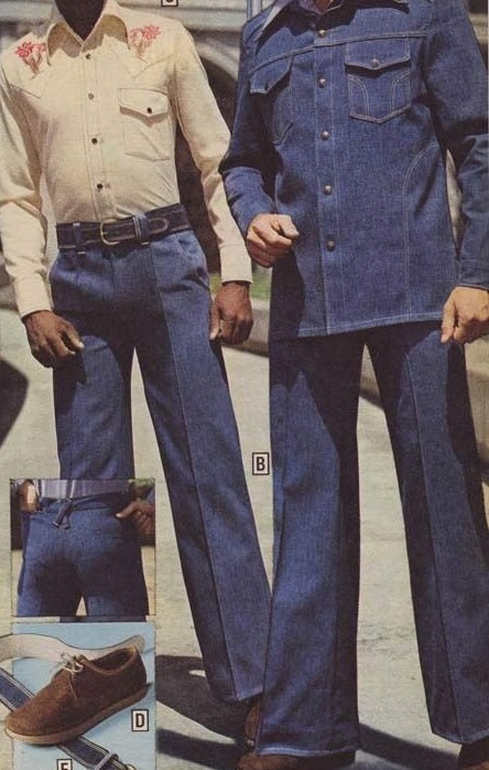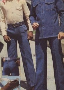 Die ausgestellten Herrenjeans sind eine Hommage an die Mode der 70er Jahre des 20. Jahrhunderts und ein Erbe der maritimen Vergangenheit der USA. Anfänglich gehörten Hosen aus grobem Stoff genau zur Kategorie der Arbeitskleidung, dichtes Gewebe wurde auch beim Nähen von Uniformen für Marinesoldaten verwendet.