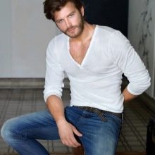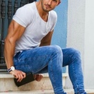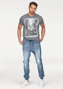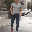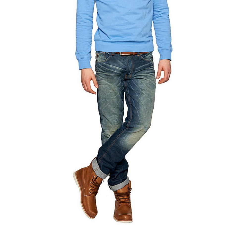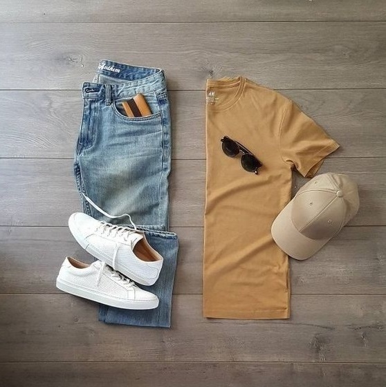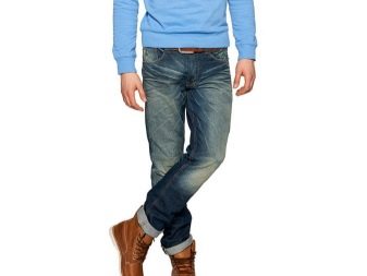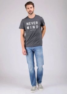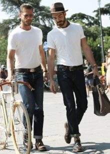 - Schlichtes T-Shirt und blaue Jeans. Ein solches Ensemble eignet sich gut für Männer, die Praktikabilität und Bequemlichkeit in ihrem Bild lieben. Dies ist eine großartige Option für den täglichen Gebrauch. Die Eleganz des Bildes wird dazu beitragen, die richtige Wahl der Schuhe zu treffen. Am besten setzt man auf olivfarbene Lederstiefel.