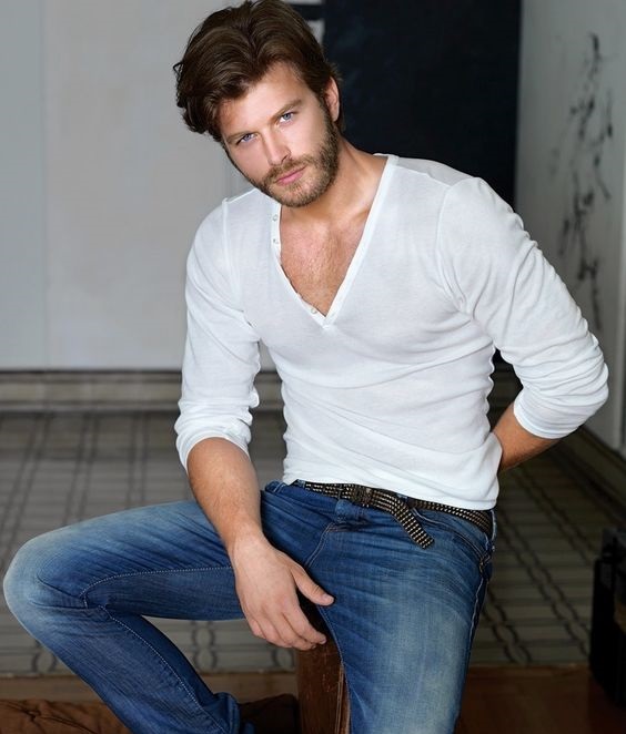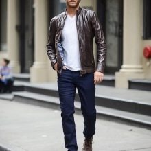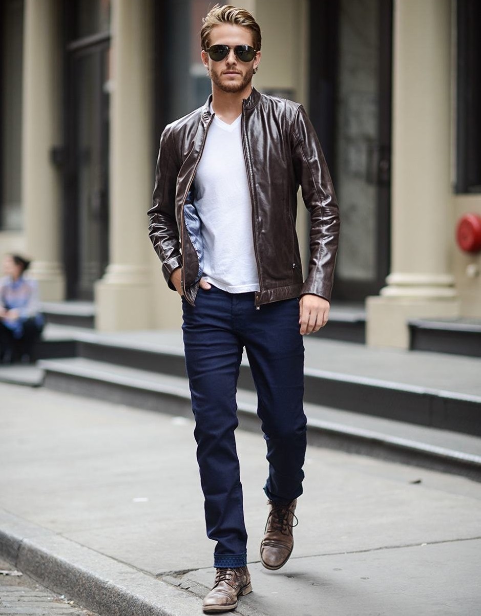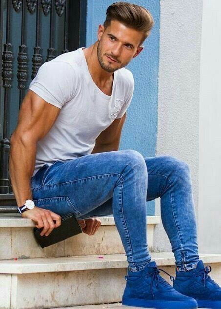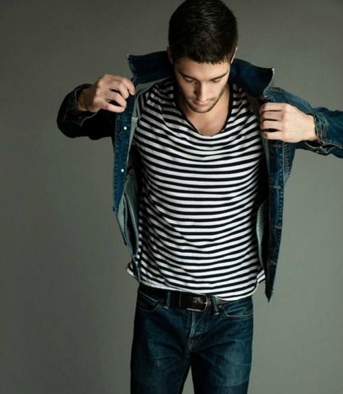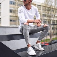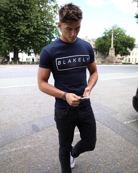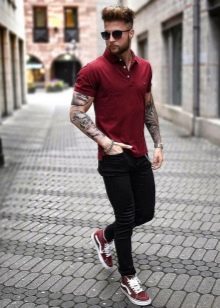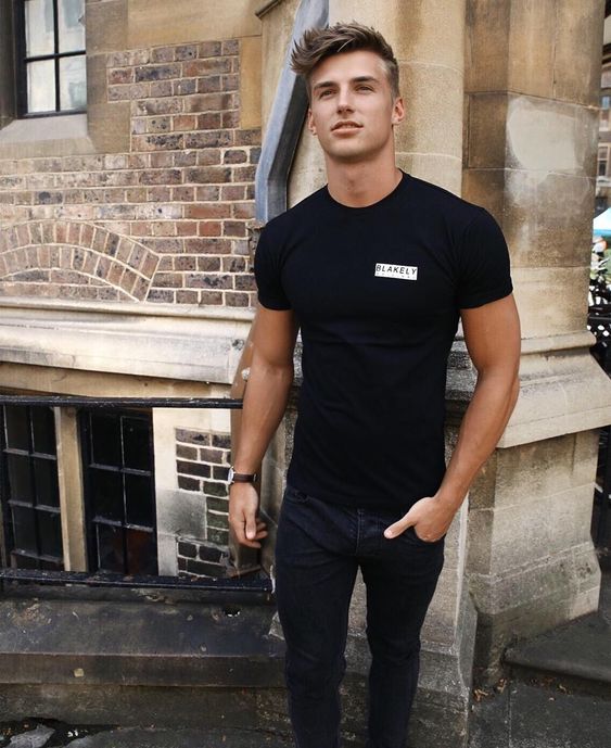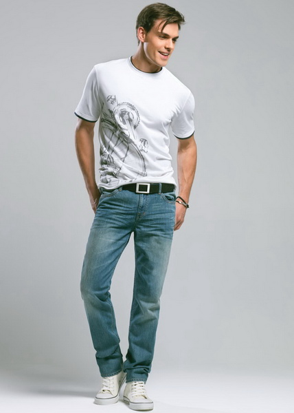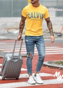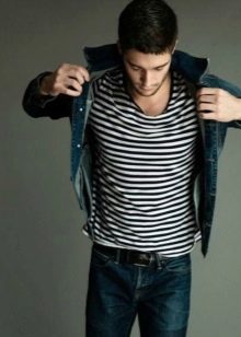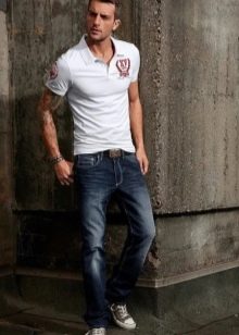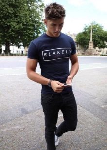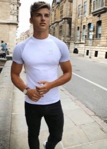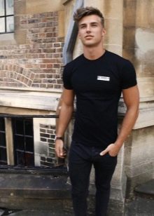 Für den Fall, dass ein Mann seine sportliche Figur demonstrieren möchte, empfehlen Stylisten, dünne T-Shirts mit schwarzen und dunkelbraunen Jeans zu kombinieren.