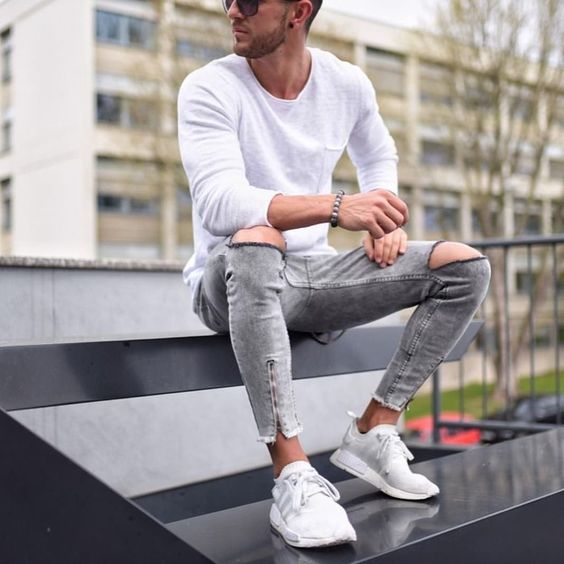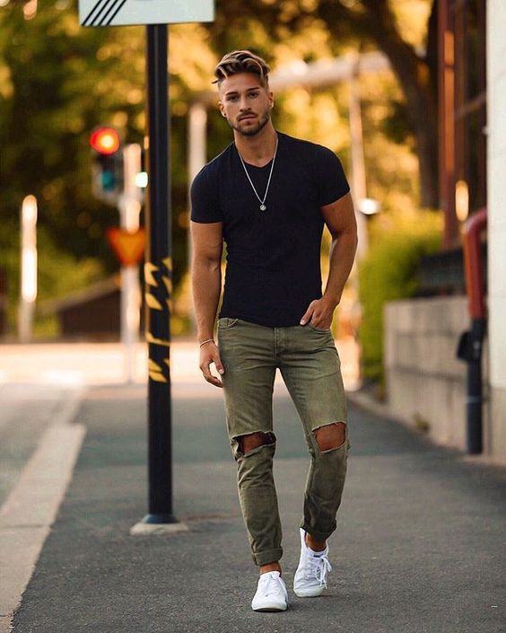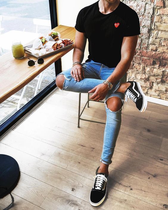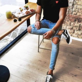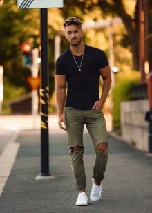- Dunkles T-Shirt und hellblaue zerrissene Jeans. Dies ist ein funktionelles Kleidungs-Ensemble, das sich ideal zum Entspannen mit einer lauten Gesellschaft von Freunden oder für einen Spaziergang im Park eignet. Sportschuhe und stylische Uhren helfen Ihnen, Ihren Look zu diversifizieren.