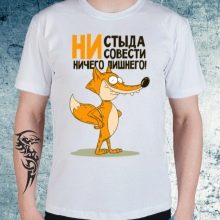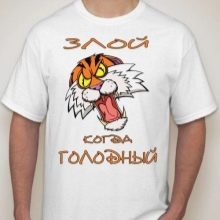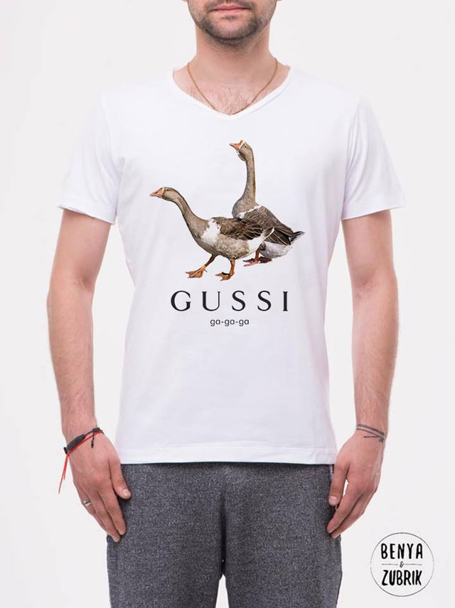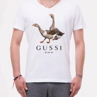 Oft werden coole Bilder mit nicht minder originalen Unterschriften ergänzt. Zum Beispiel, das Design von "GUSSI" sieht kreativ aus mit einer Aufschrift im Geiste der berühmten GUCCI und dem Bild der Gänse... Interessant sehen T-Shirts mit Aufdrucken von menschlichen Figuren aus, bei denen Bilder aus dem Nacken einer Person gezeichnet werden.